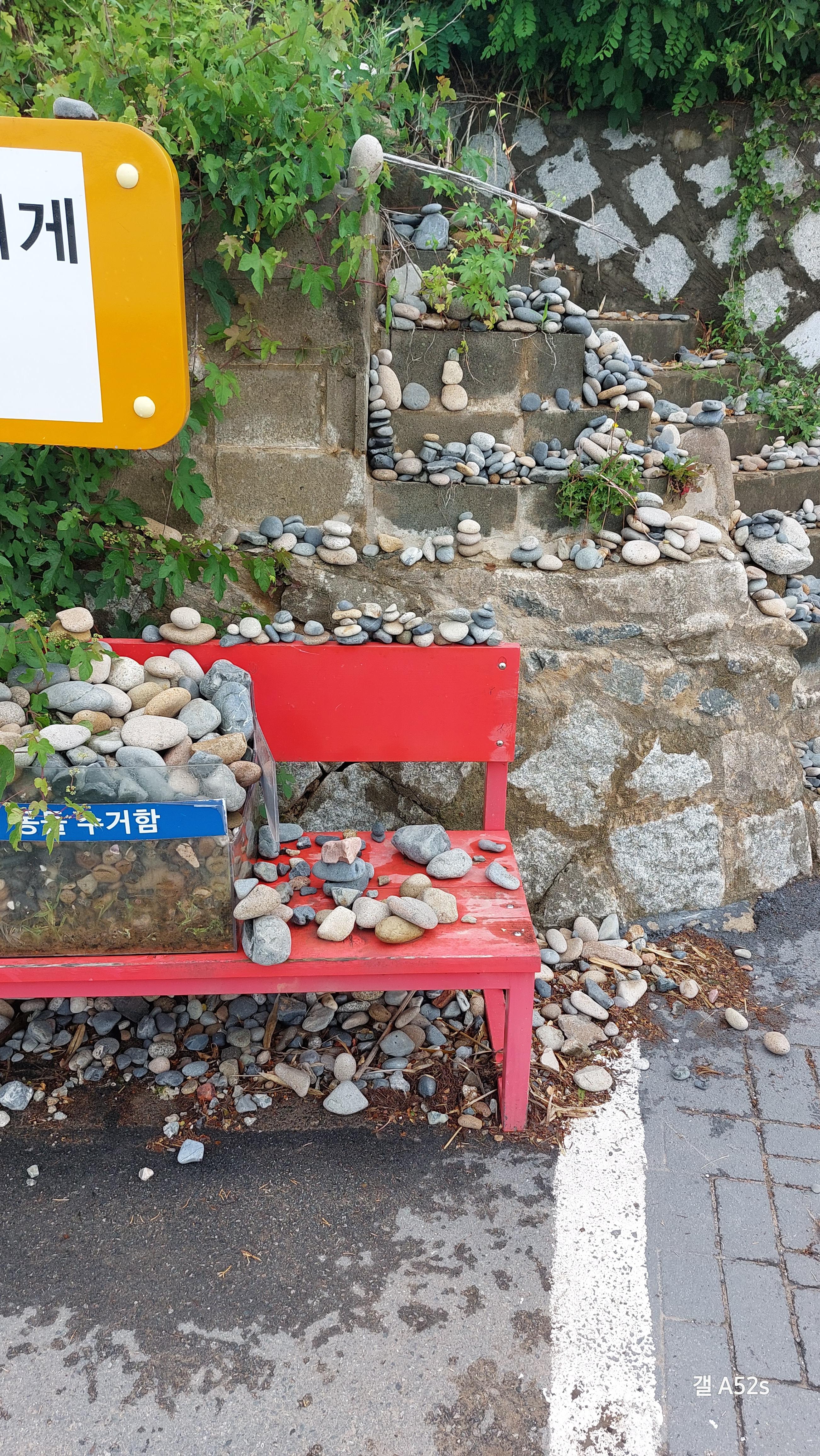 이 귀요미 안내판에 몽돌을 쌓아 올렸습니다.