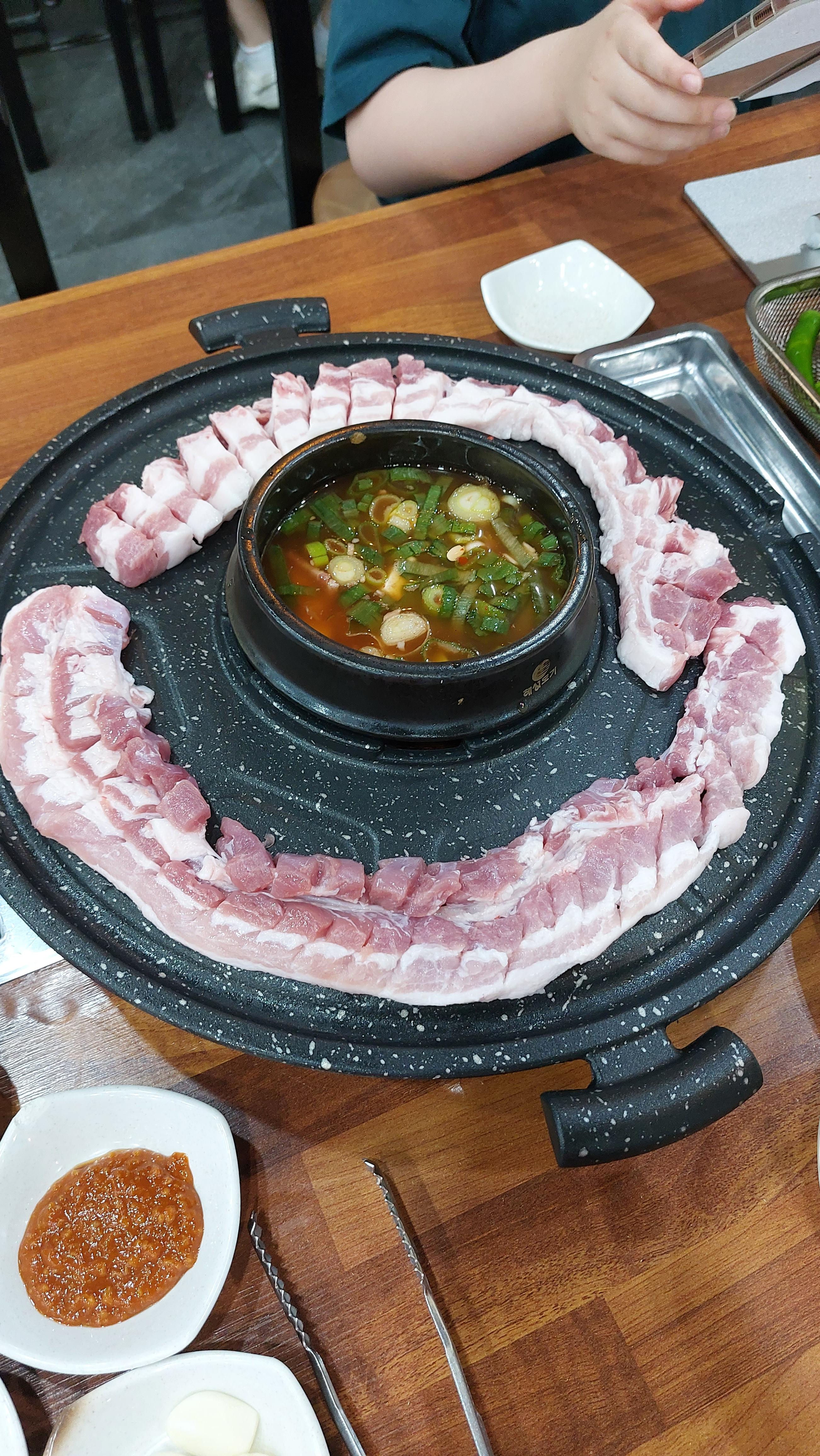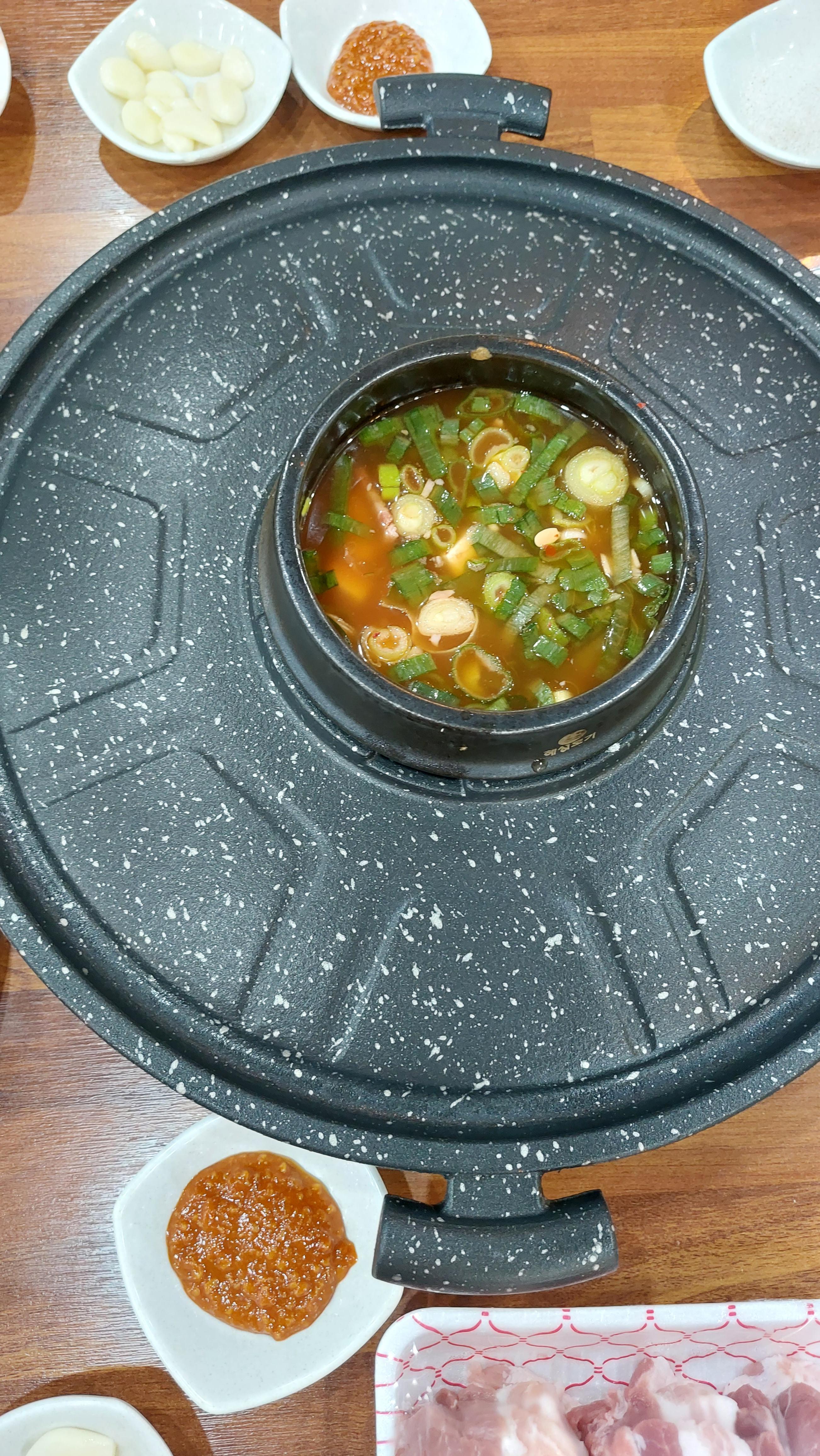 여기 불판은 신기한게 가운데 된장찌개가 올라갑니다.