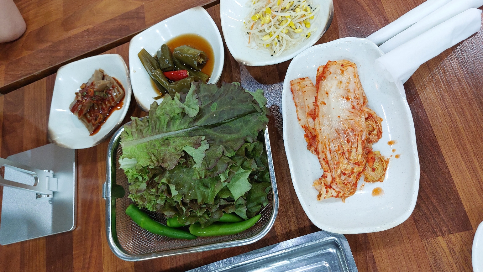 기본적으로 쌈이랑 기본반찬들이 많이 차려져 있는데 상차림 비를 안 맞는다고 하니까 너무 좋네요