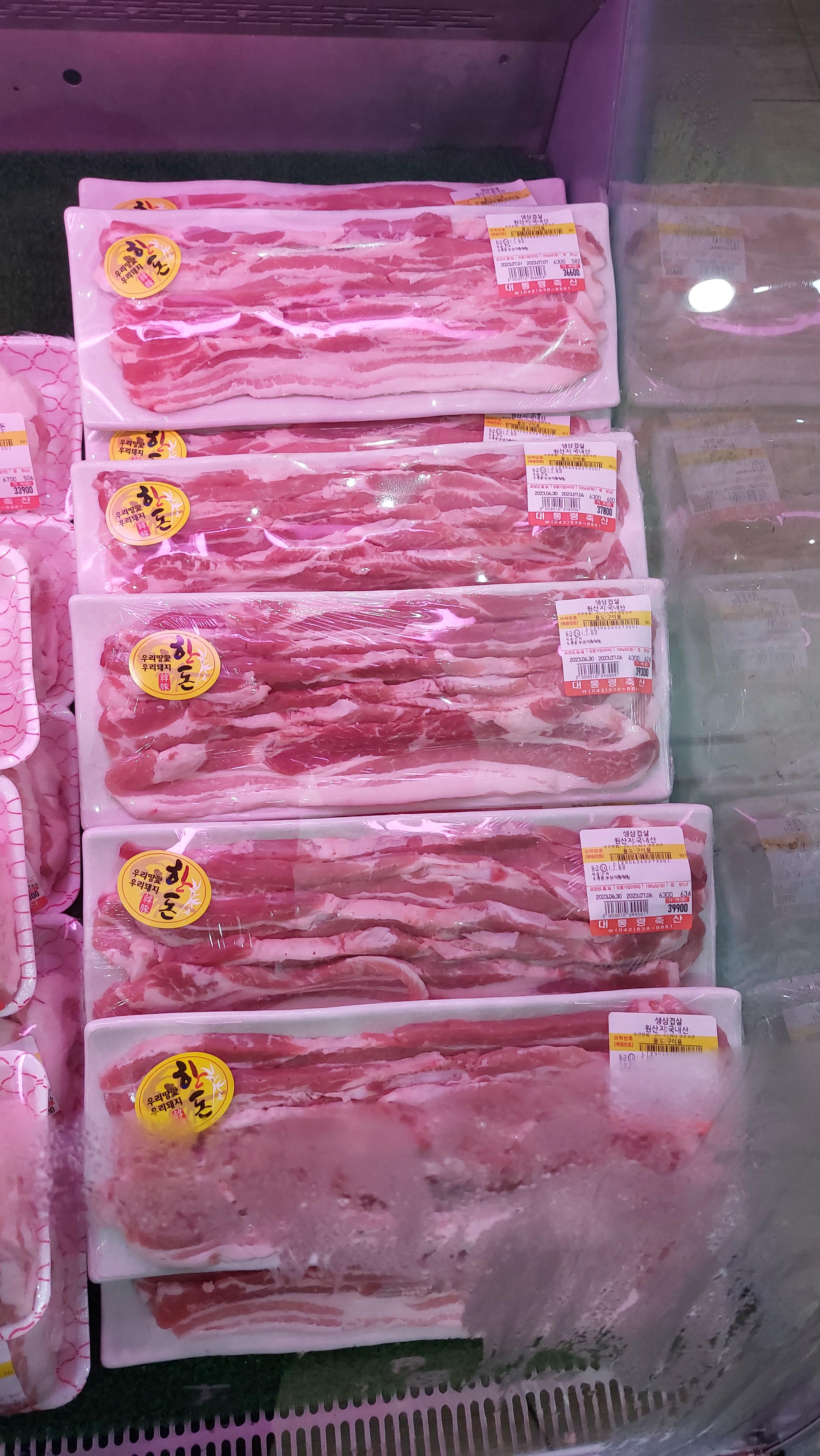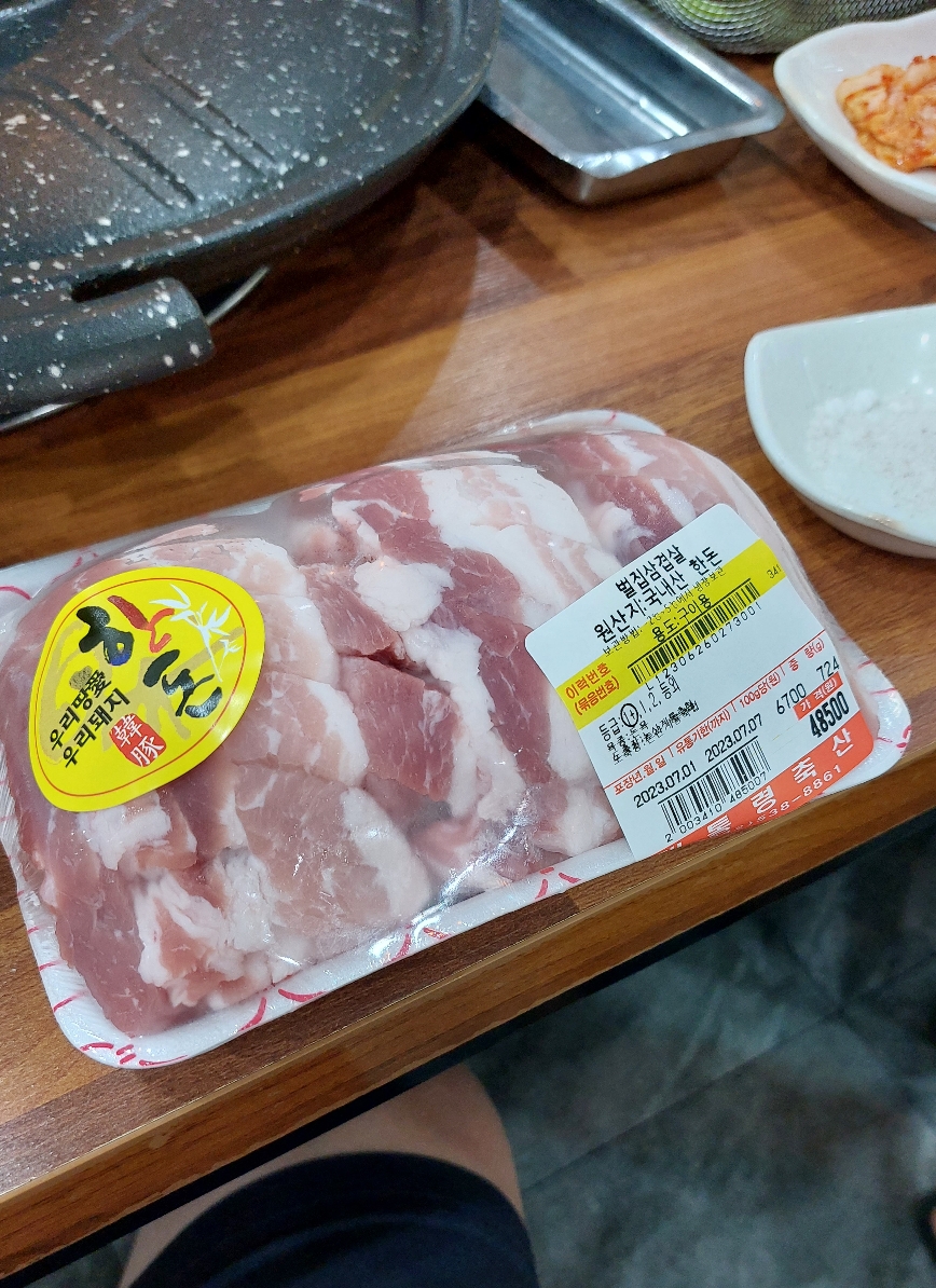 저 같은 경우는 삼겹살을 한 600그램 정도 가지고 왔는데 100그램당 6500원에 판매를 하고 있었어요.