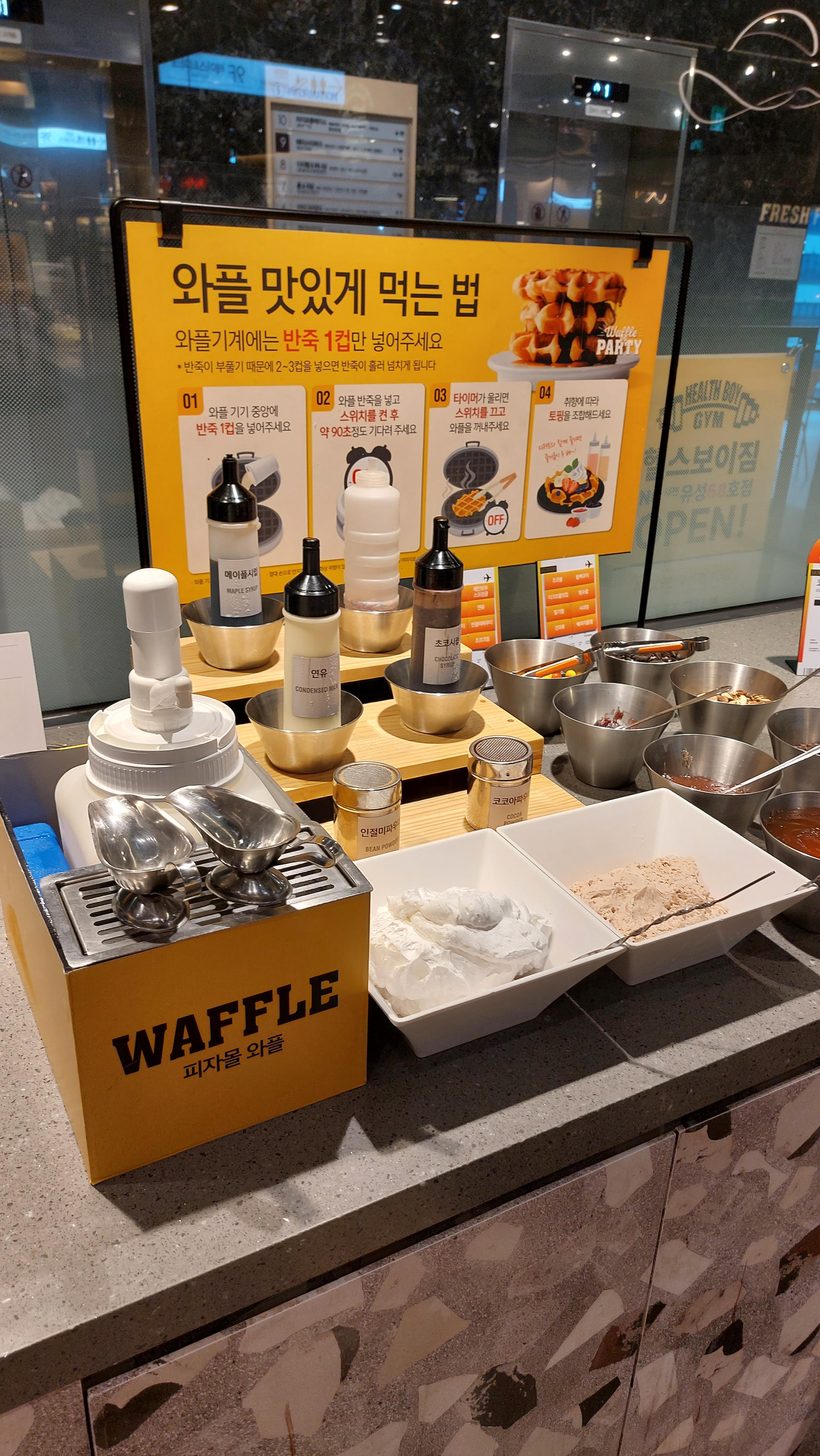 와플에 올려먹는 생크림이나 땅콩 그림 그리고 사과잼이랑 딸기잼 있었는데...