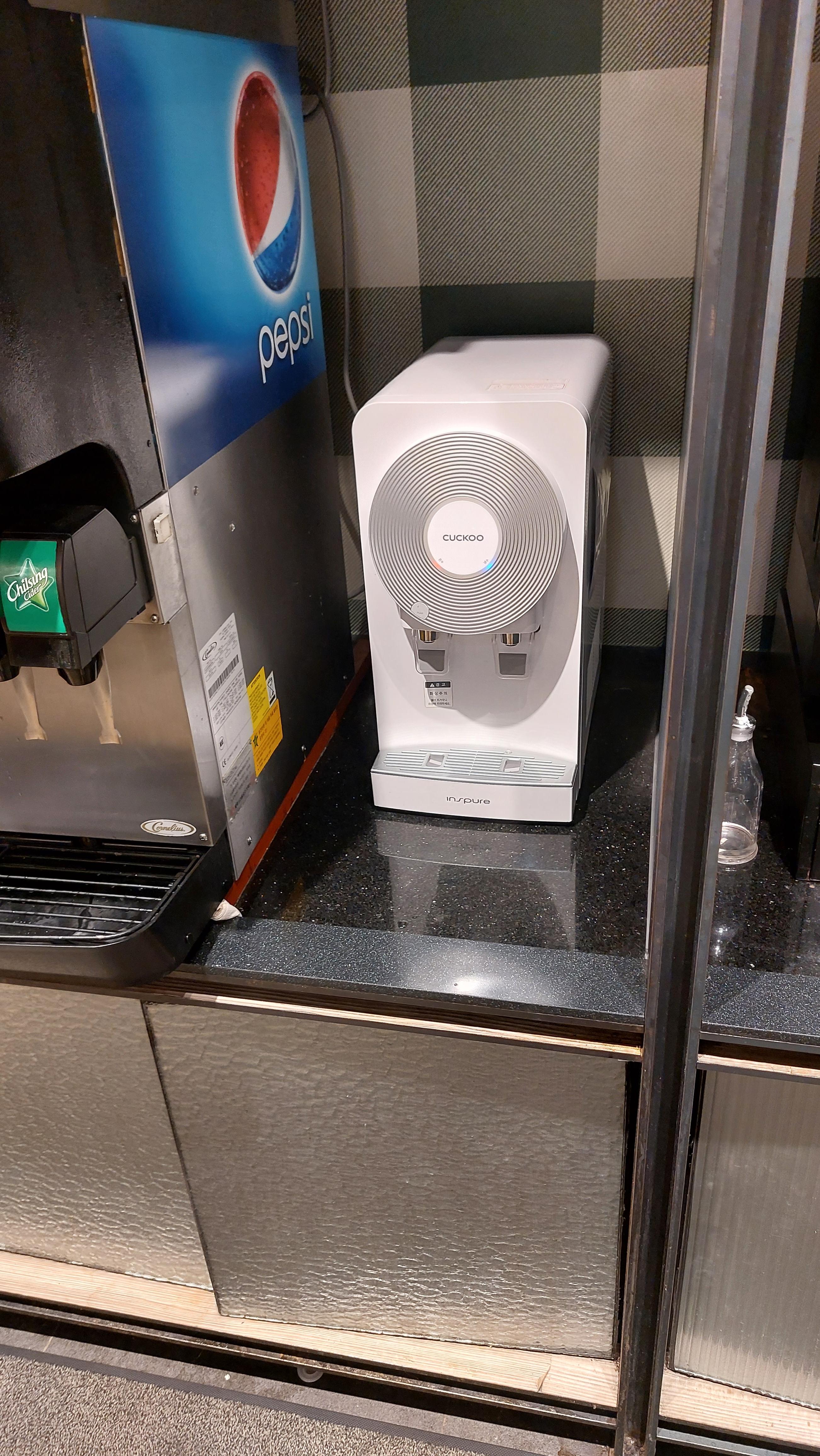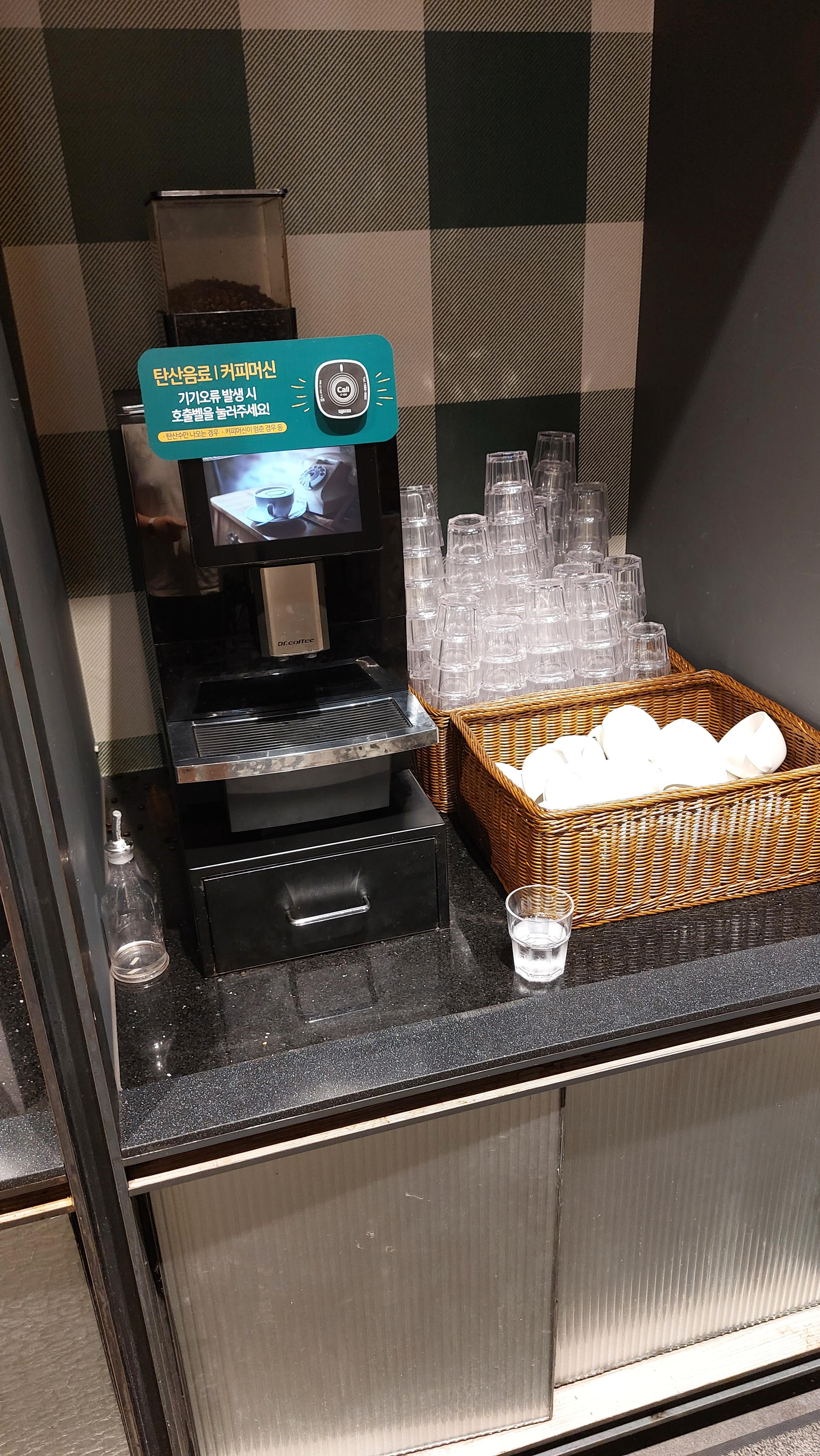 음료수도 다 제공되어 있고요 생수도 마실 수 있고 그 옆에 와플 기계 한 아이스크림도 있습니다.