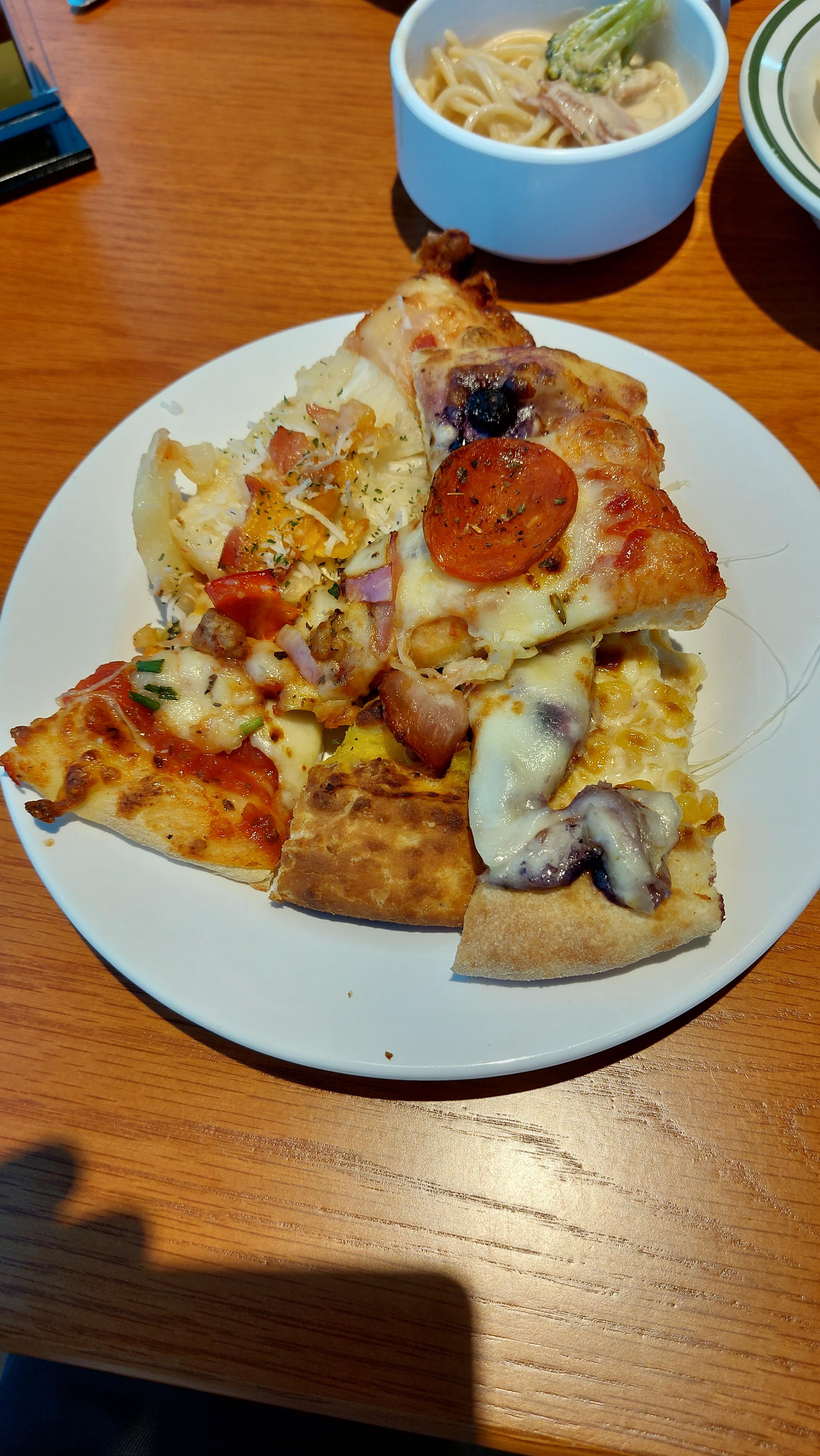 어떤 피자가 맛있을지 몰라서 이 피자 저 피자 거의 모든 피자를 다 가지고 왔습니다.