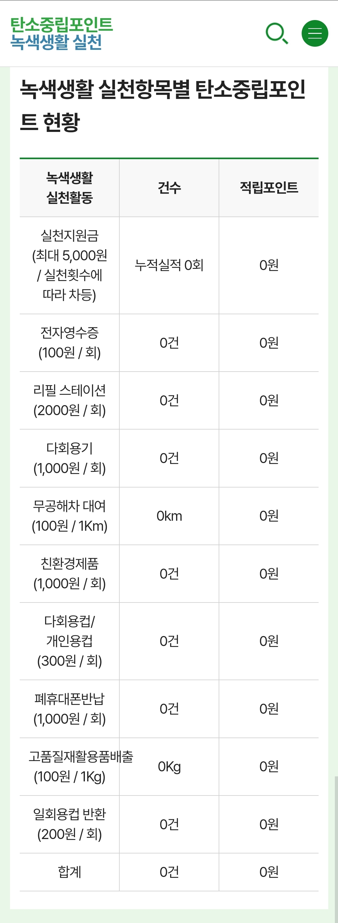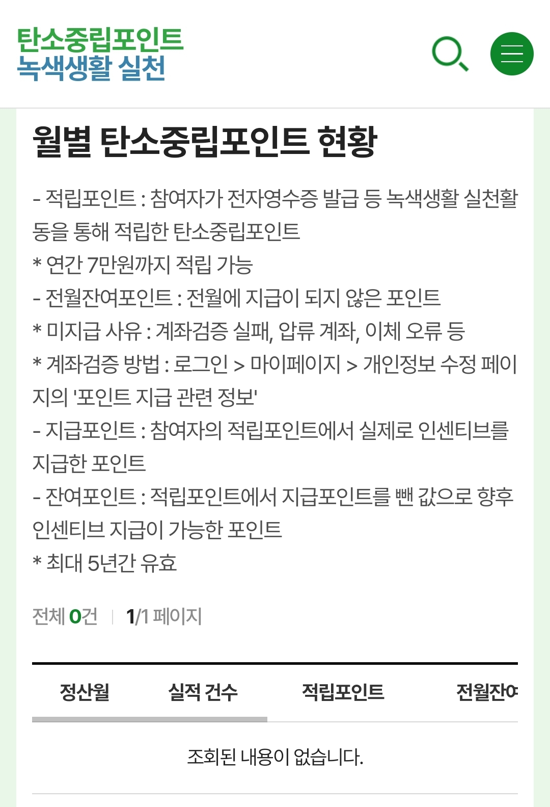 저는 탄소중립포인트 사이트 가입후 스마트 영수증을 받지 않아봐서 건수나 포인트가 발생되지 않았습니다.