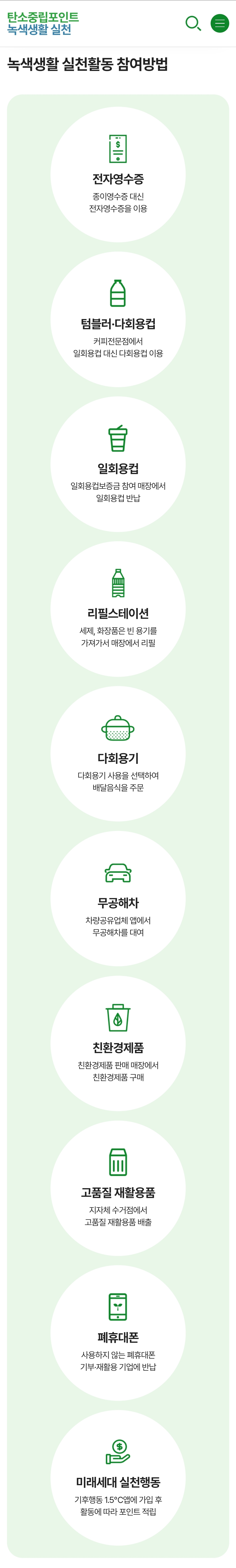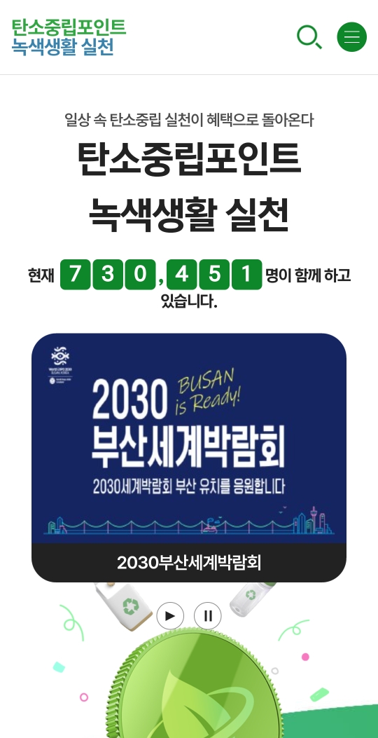 일상 속 탄소중립 실천이 혜택으로 돌아온다 탄소중립포인트 녹색생활 실천 현재 730625명이 함께 하고 있습니다.