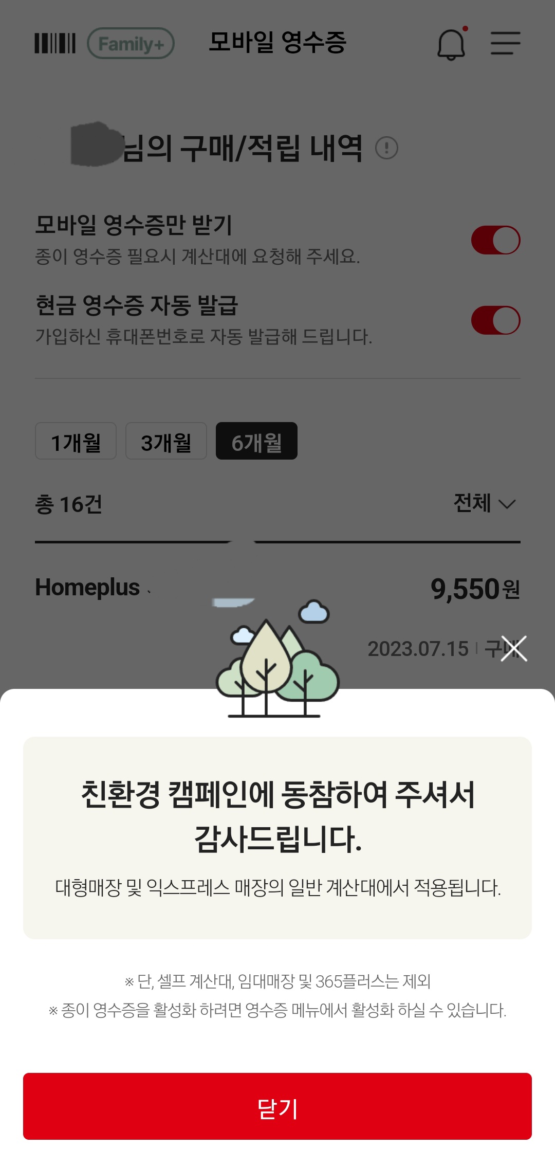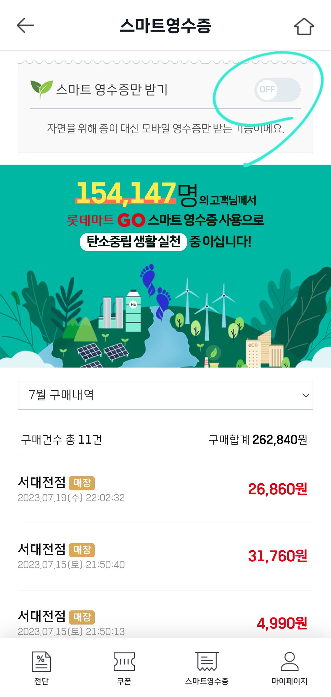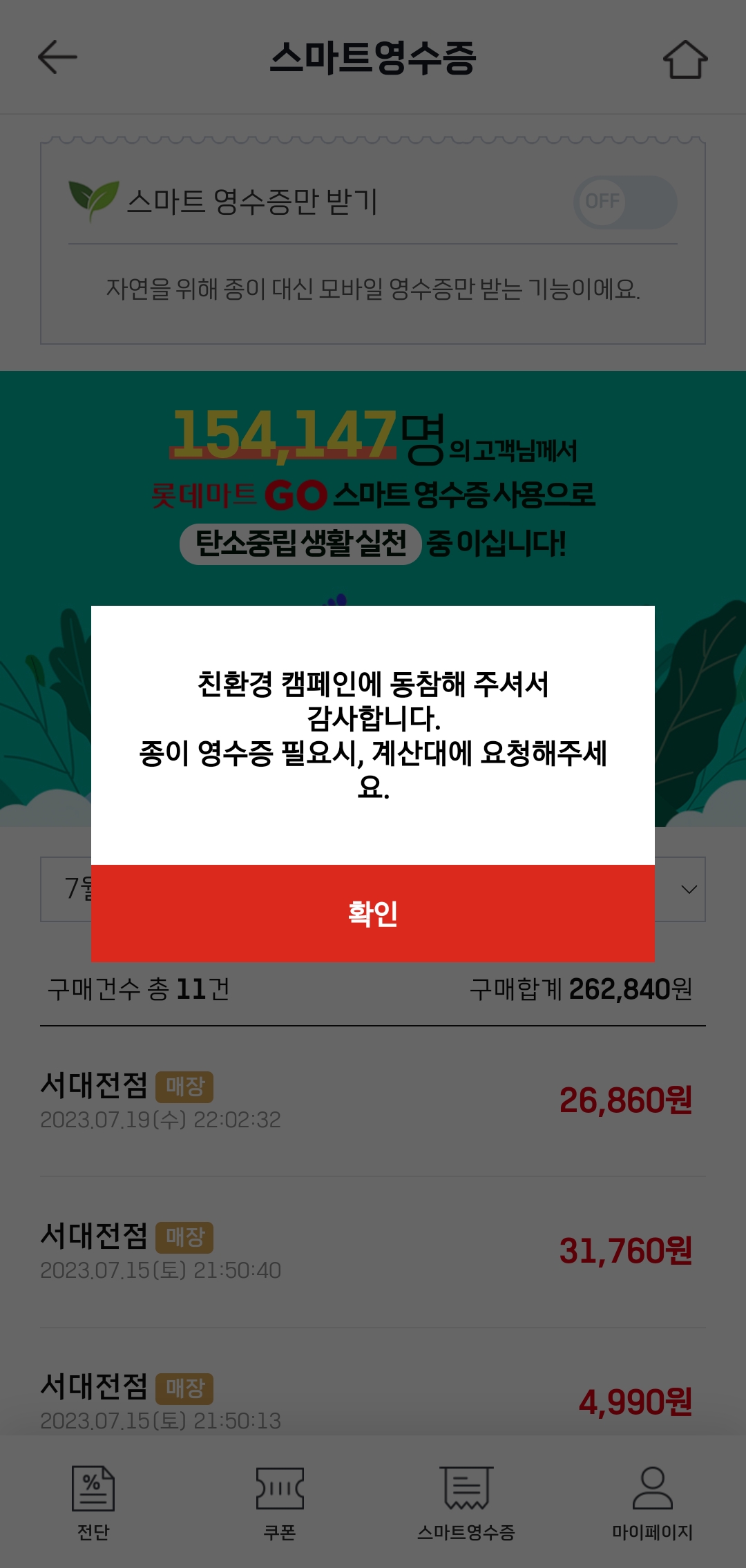 2. 각 마트별 앱상에서 영수증 수령방법을 모바일 영수증으로 변경함.