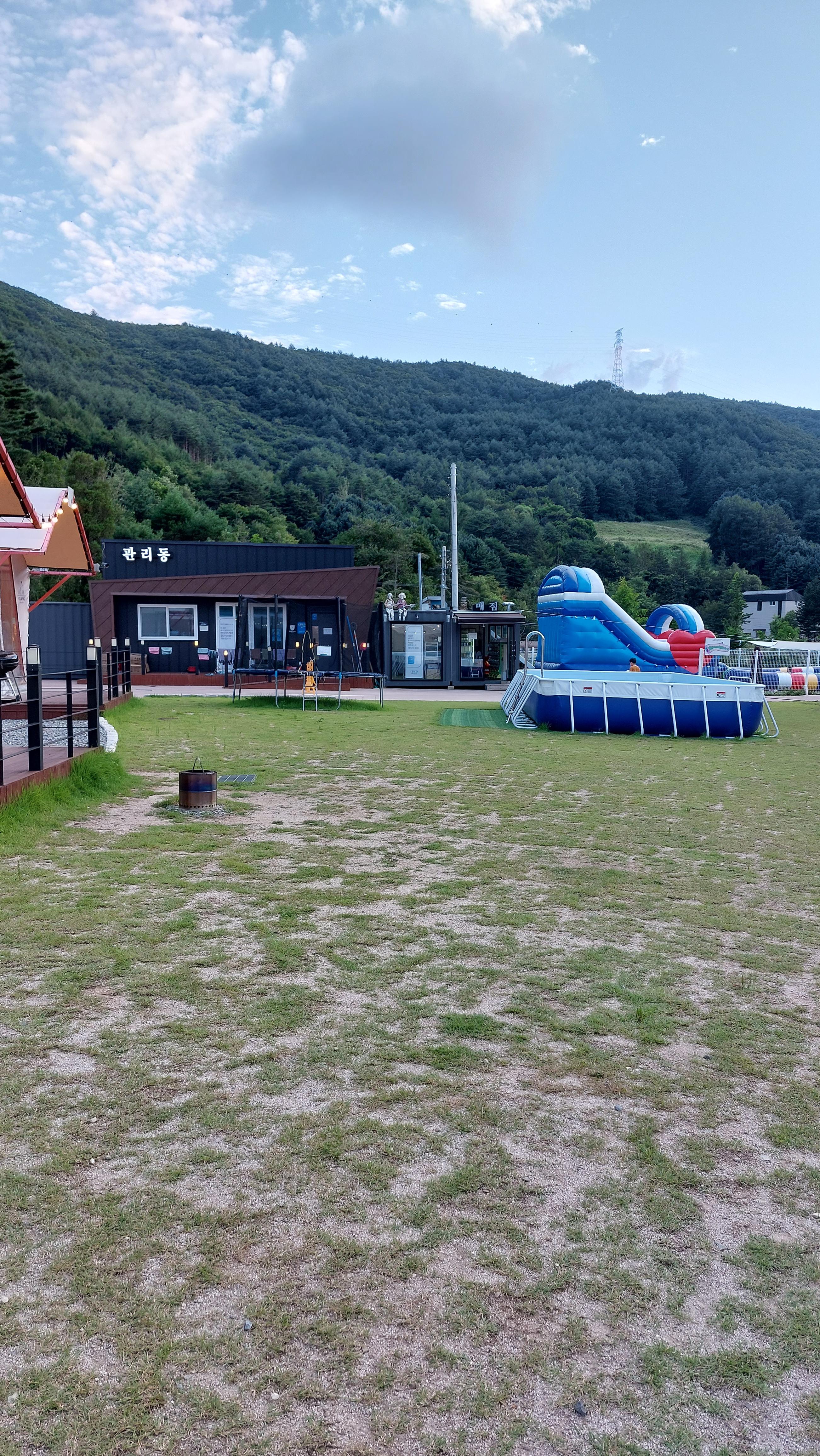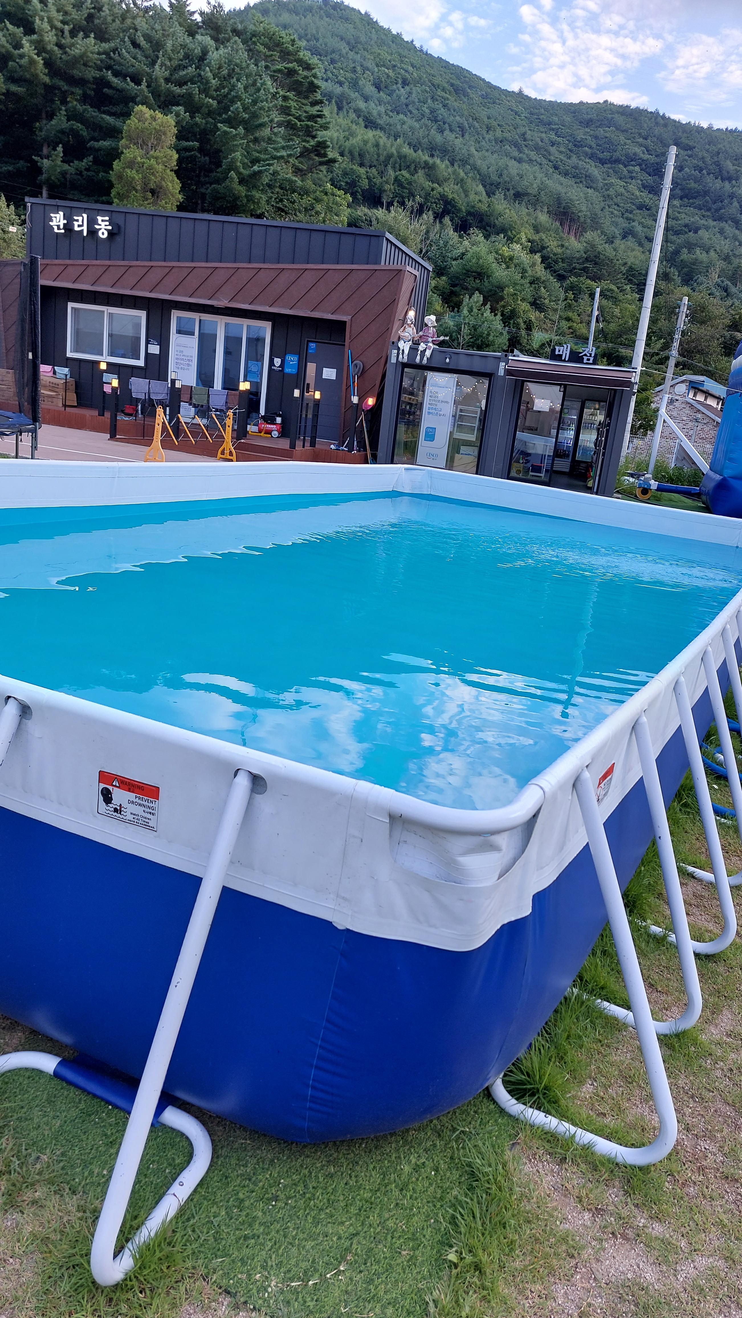 정선 글램핑 글램인스타에는 풀장이 2군데나 있습니다. 하나는 넓은 풀이고, 나머지는 에어바운스 미끄럼틀이 있는 풀입니다.