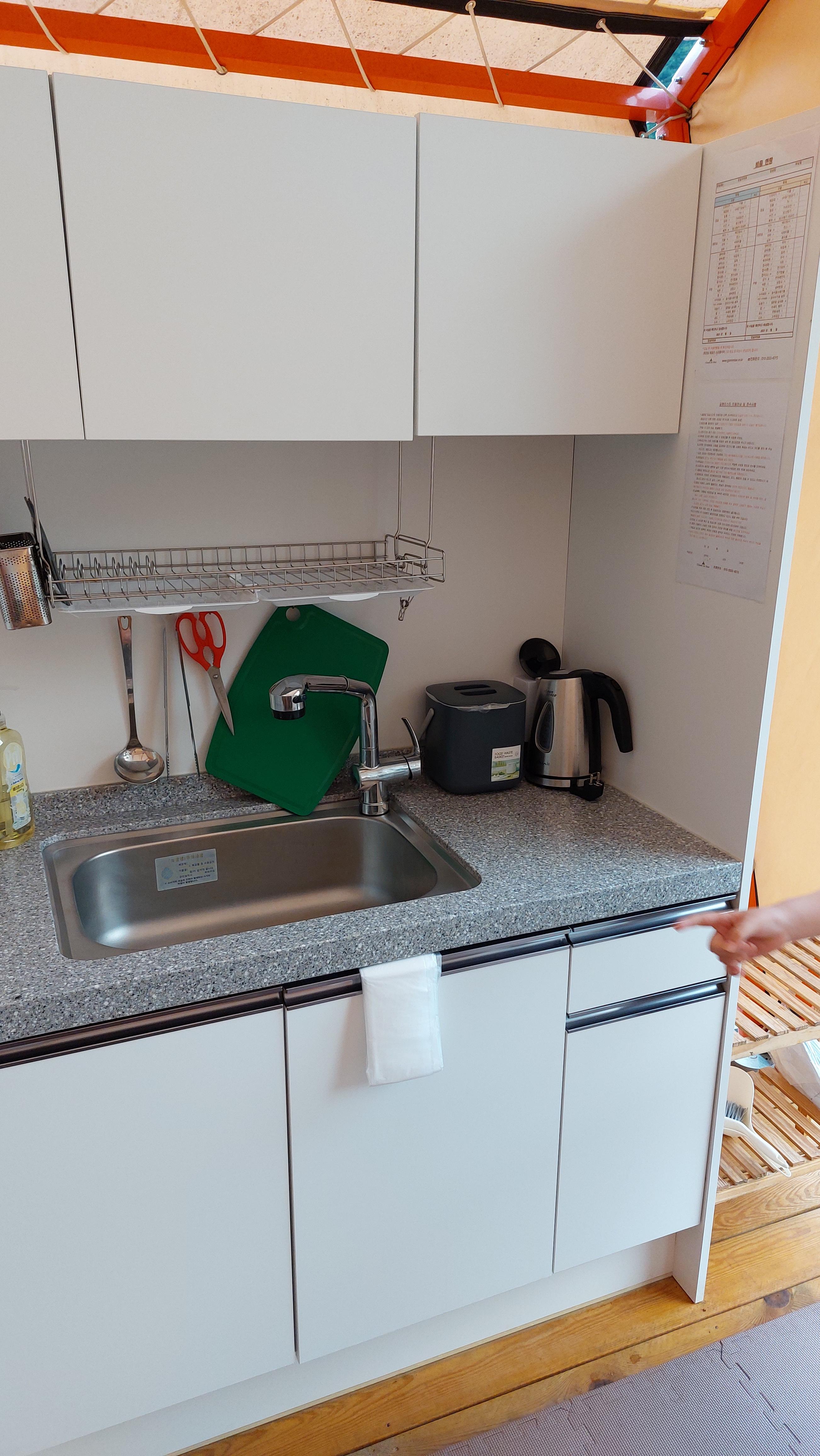 캠핑의자나 테이블, 티비, 냉장고, 싱크대, 전기밥솥, 에어컨, 접시, 가위, 수저 젓가락 전부다 ~~~ 있기 때문에 정말 편합니다.