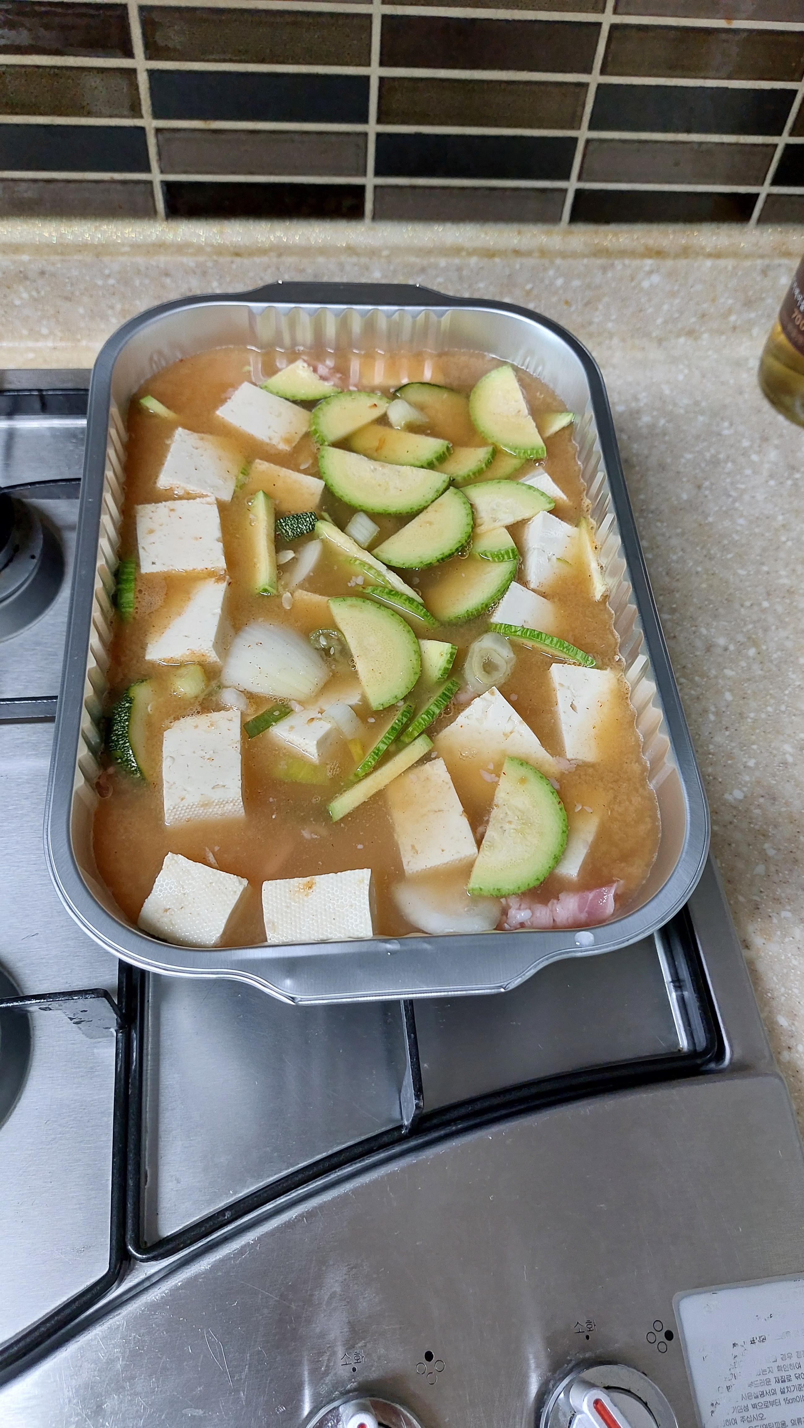우삼겹 된장찌개라서 우삼겹이 들어가 있고, 야채(호박, 양파, 대파, 고추), 두부, 찌개양념이 들어가 있습니다.