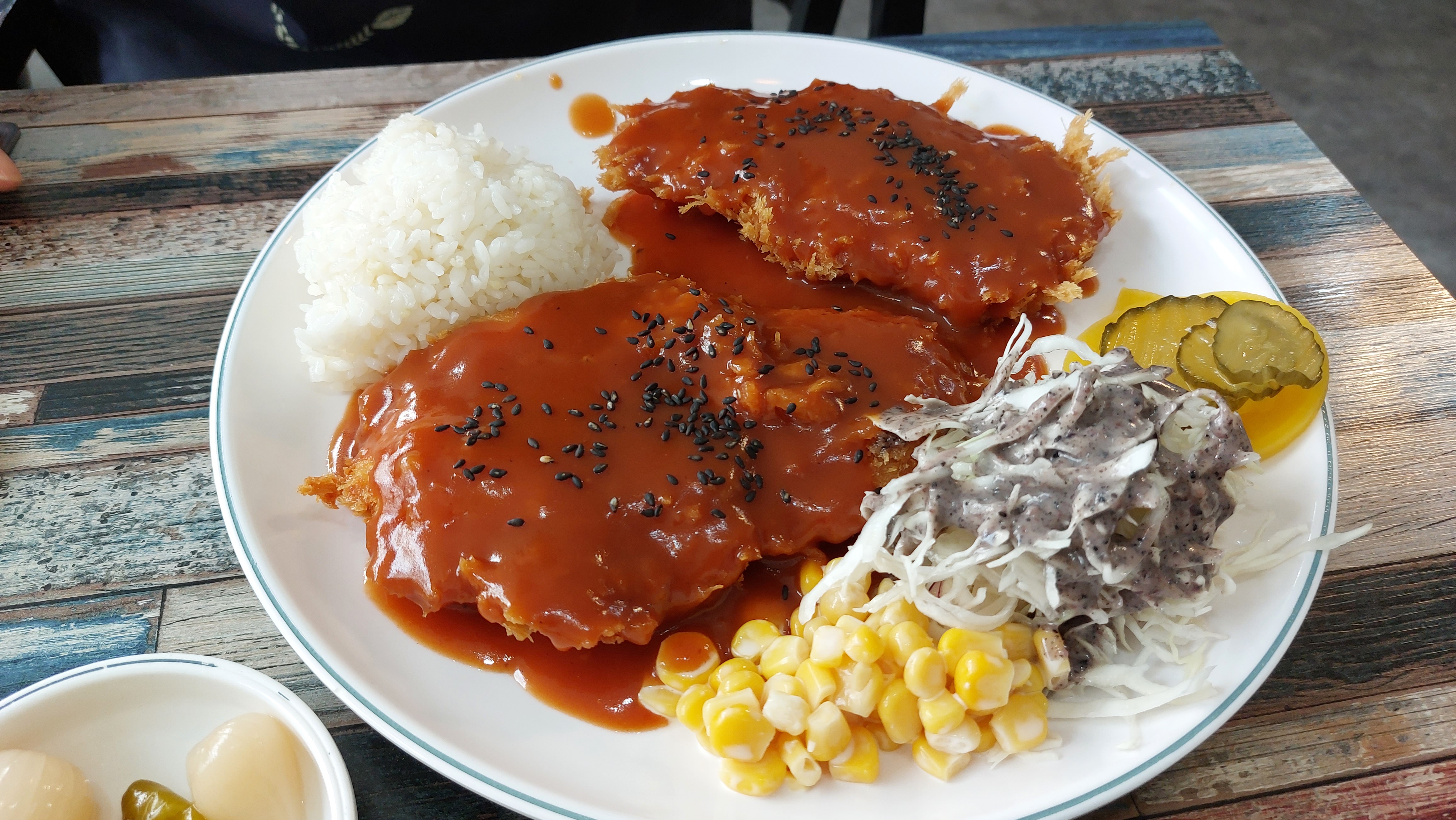 사이드 반찬은 단무지, 오이피클, 양배추 샐러드, 콘샐러드, 밥 한스쿱 나옵니다.