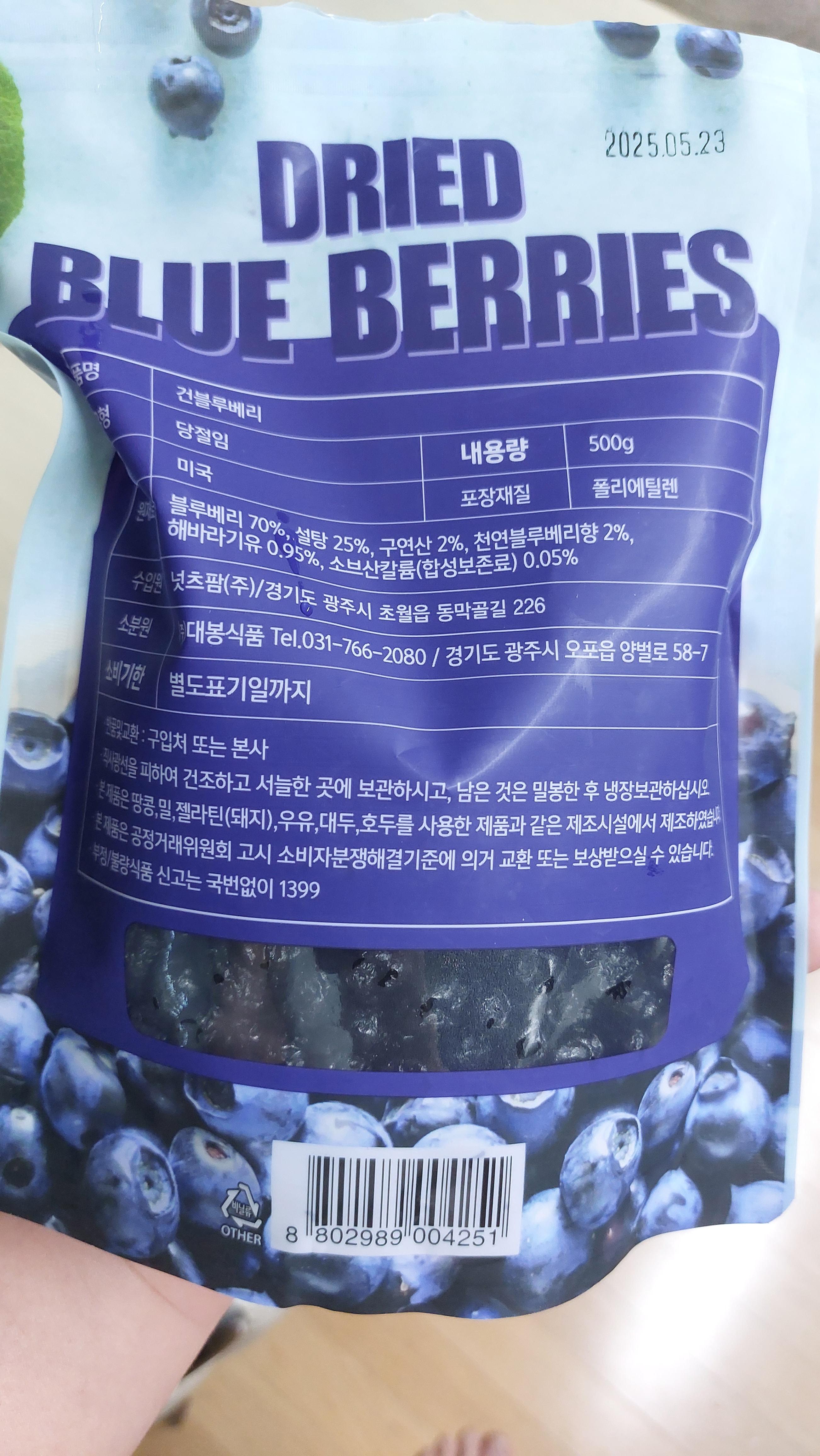 한 봉지에 500g이 들어 있고 블루베리가 70%나 들어 있다고 합니다.