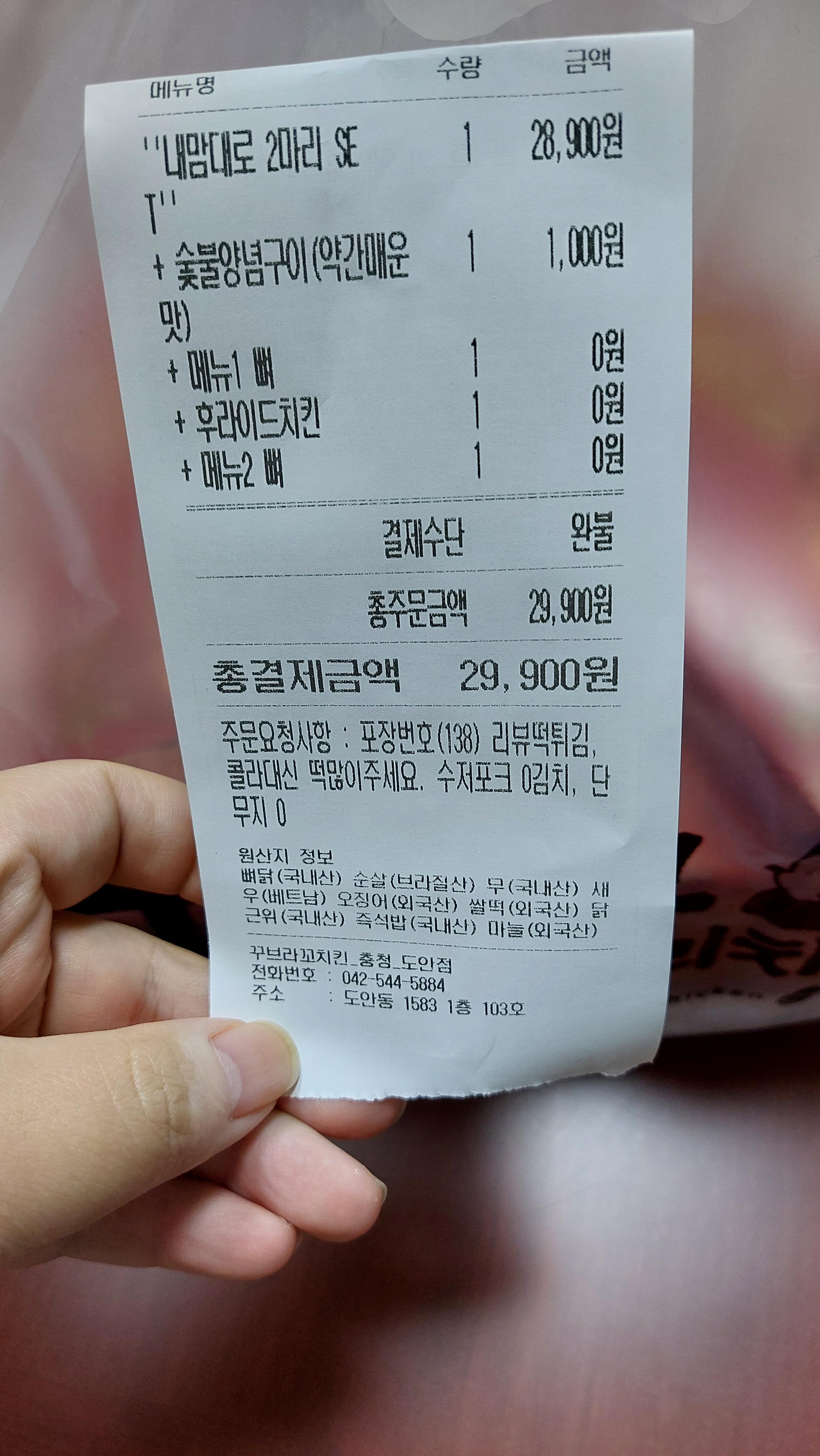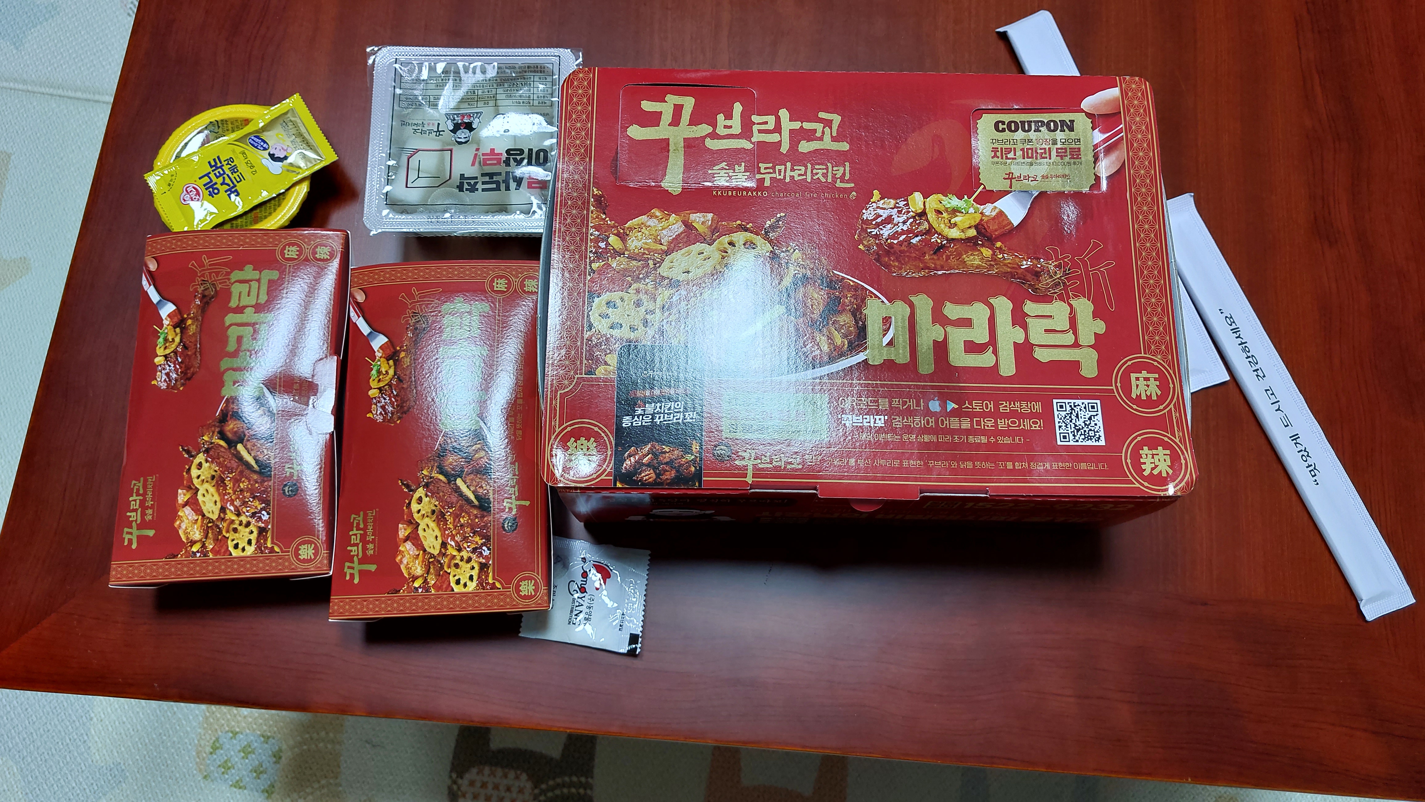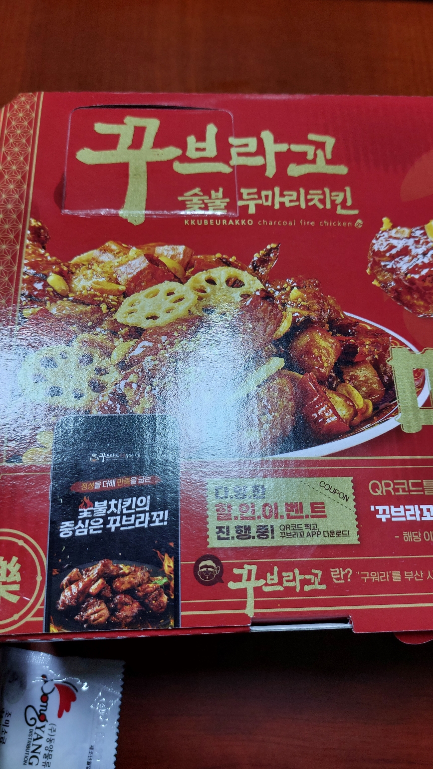 꾸브라꼬 숯불두마리치킨 도안점에서 포장으로 시켜 먹었습니다.