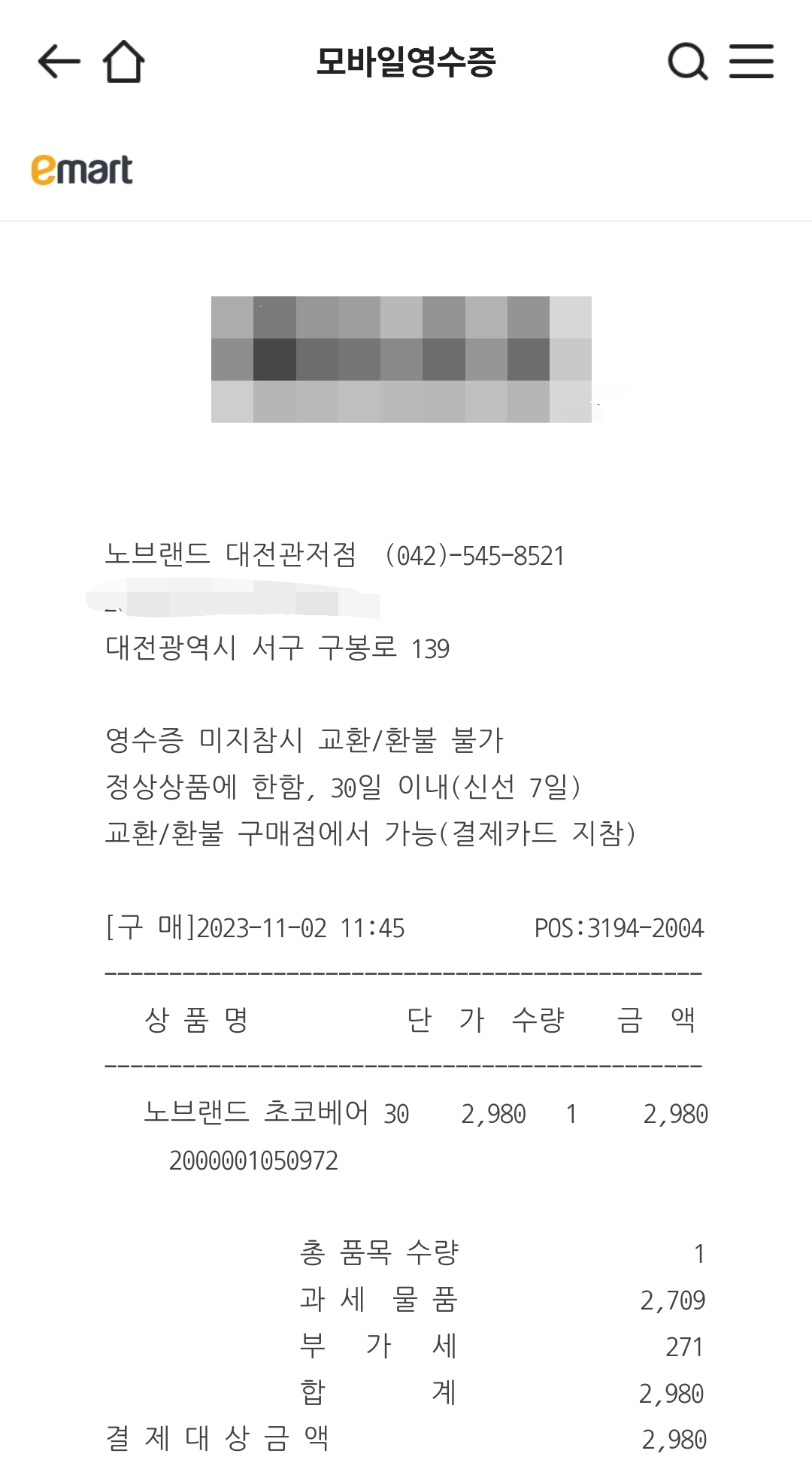 노브랜드에서 새로 구매한 과자 상품명은 초코 베어