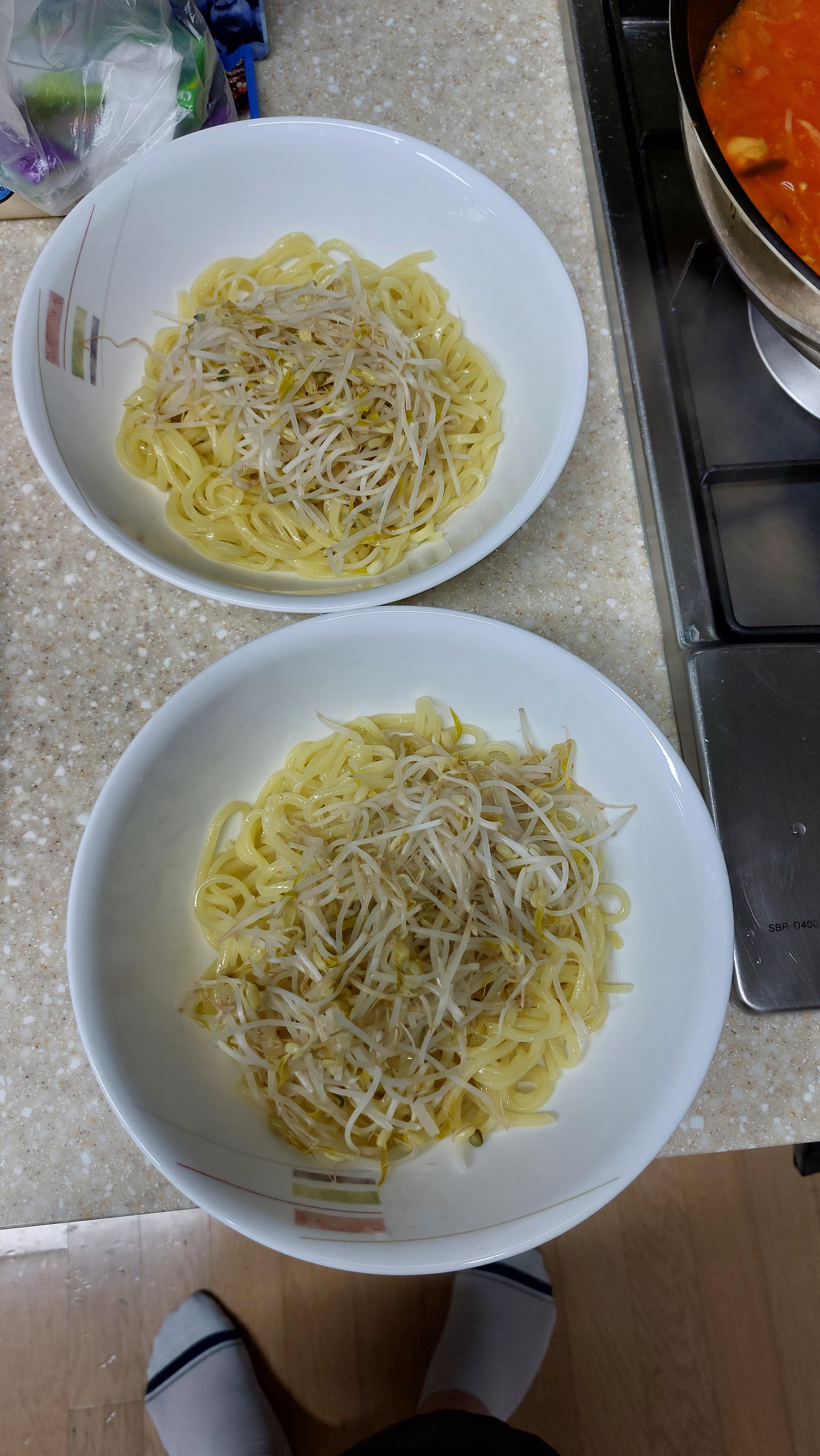 짬뽕면를 그릇에 담고, 볶은 숙주를 반반씩 넣어 줍니다.