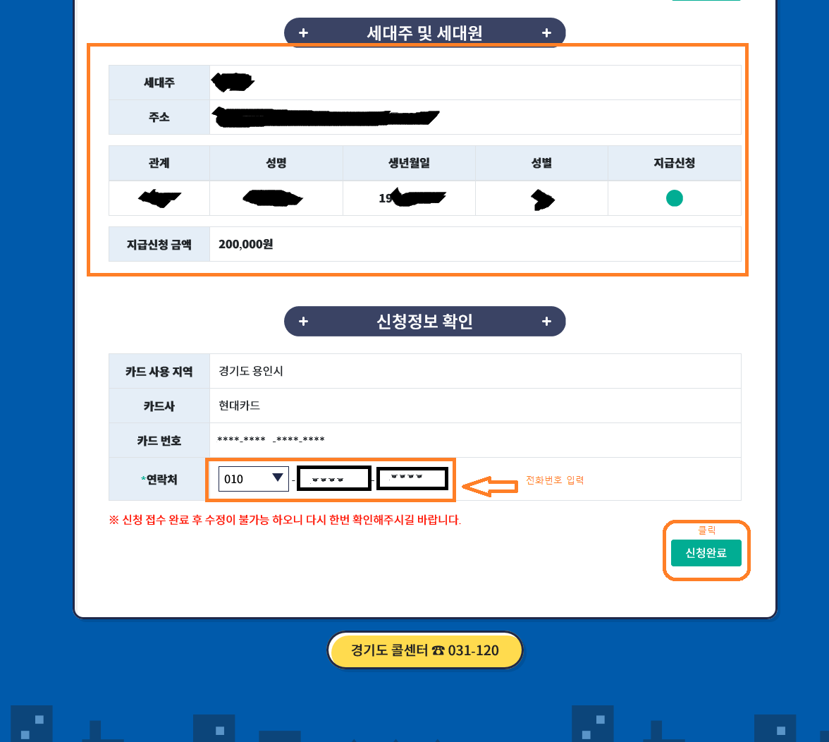 7. 세대주 및 세대원을 내용을 확인하고, 연락처 기재후 신청 완료 클릭하면 끝!