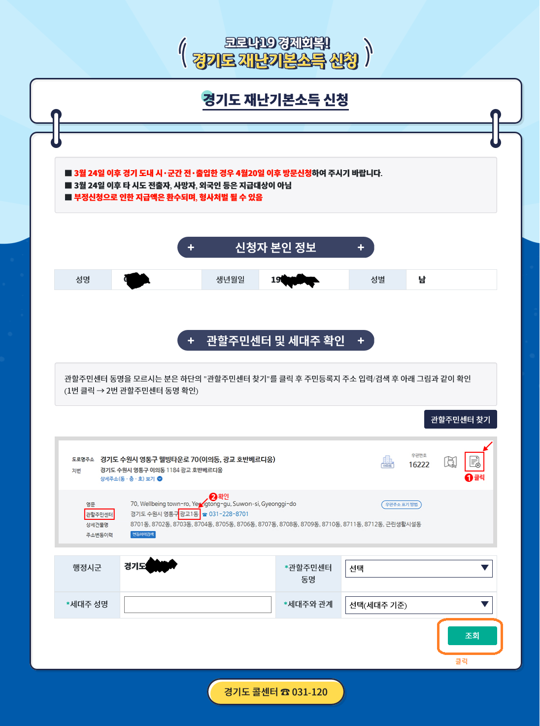 6. 관할주민센터 선택 후 세대주이름, 세대원일경우 세대주와의 관계를 적으시고 "조회" 클릭 하면...