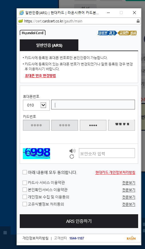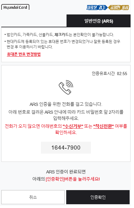ars 인증하기를 누르면 아래 와 같은 창이 뜨고 해당 휴대폰으로 전화가 오고, 이때 비밀번호 앞2자리를 입력하시면 인증이 완료됩니다.
