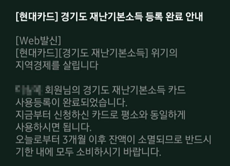 신용카드사로 지원금이 입금이 되고, 입금이 되면 카드사에서 좀전에 적었던