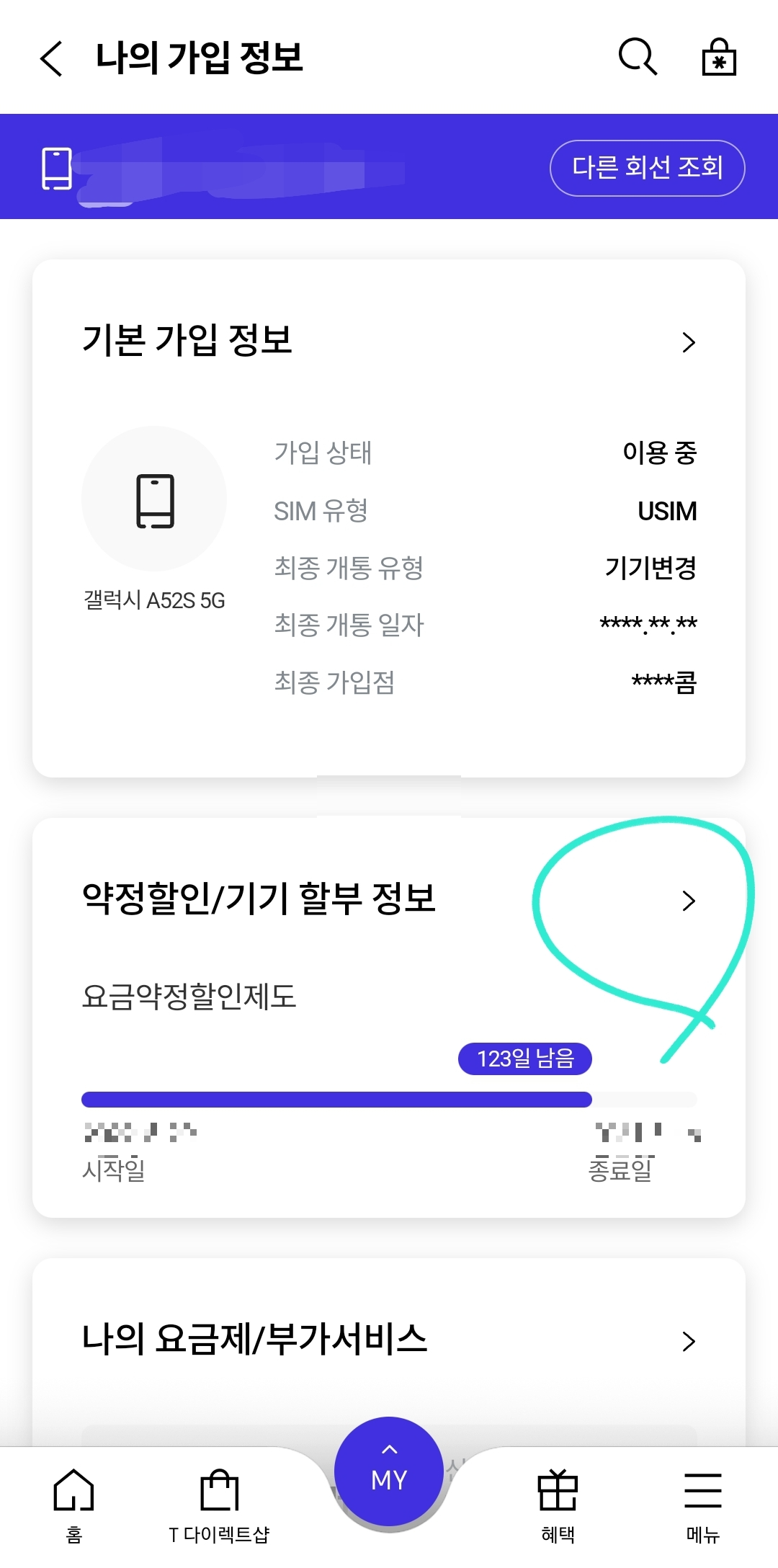 4. 나의 가입정보 메뉴에서 "약정할인/기기할부정보" 메뉴를 선택합니다.