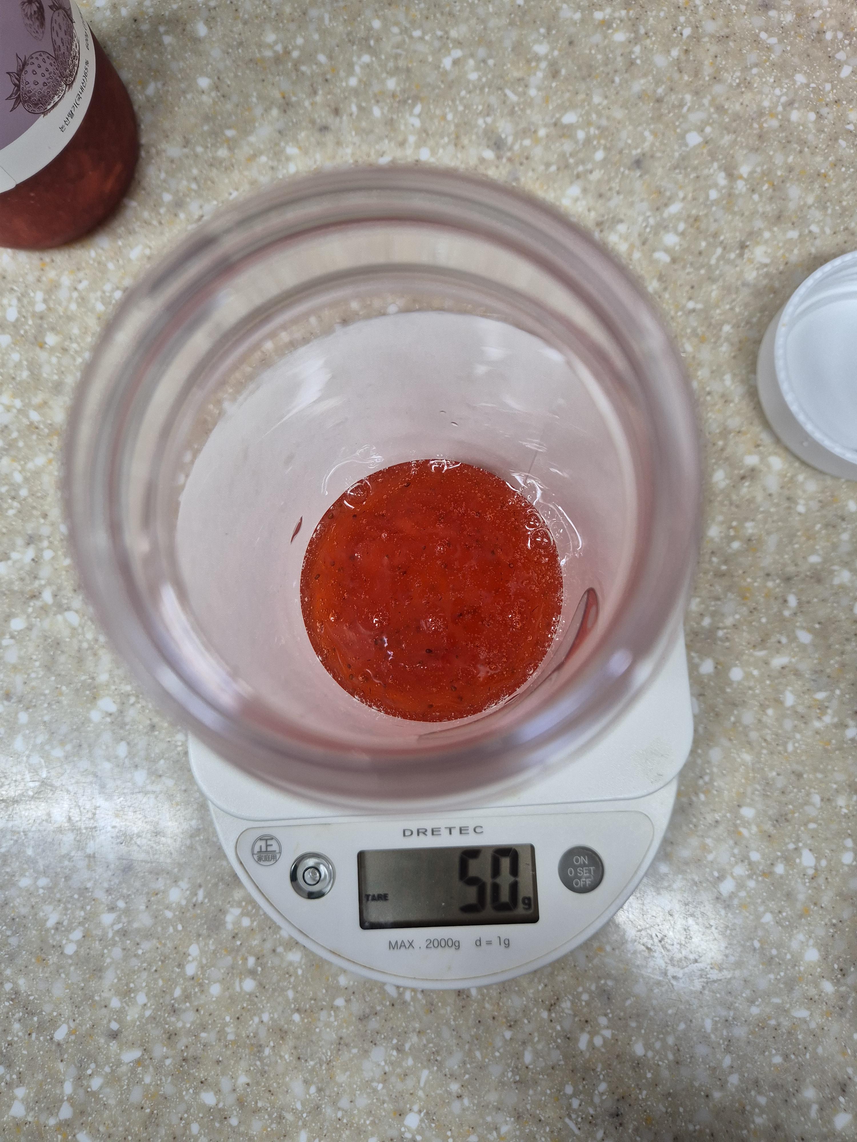 1. 빈 텀블러에 딸기청 50mm를 넣고요.