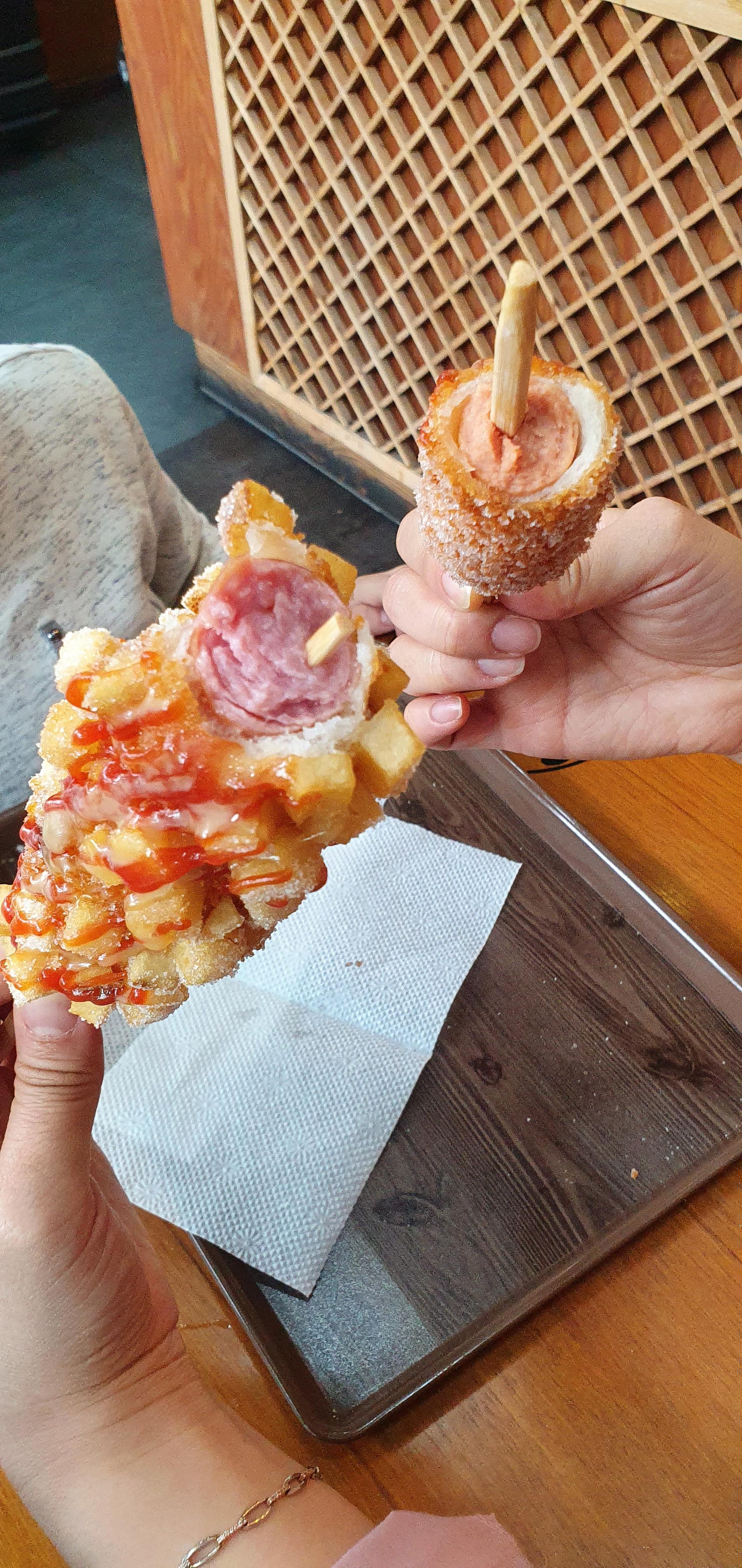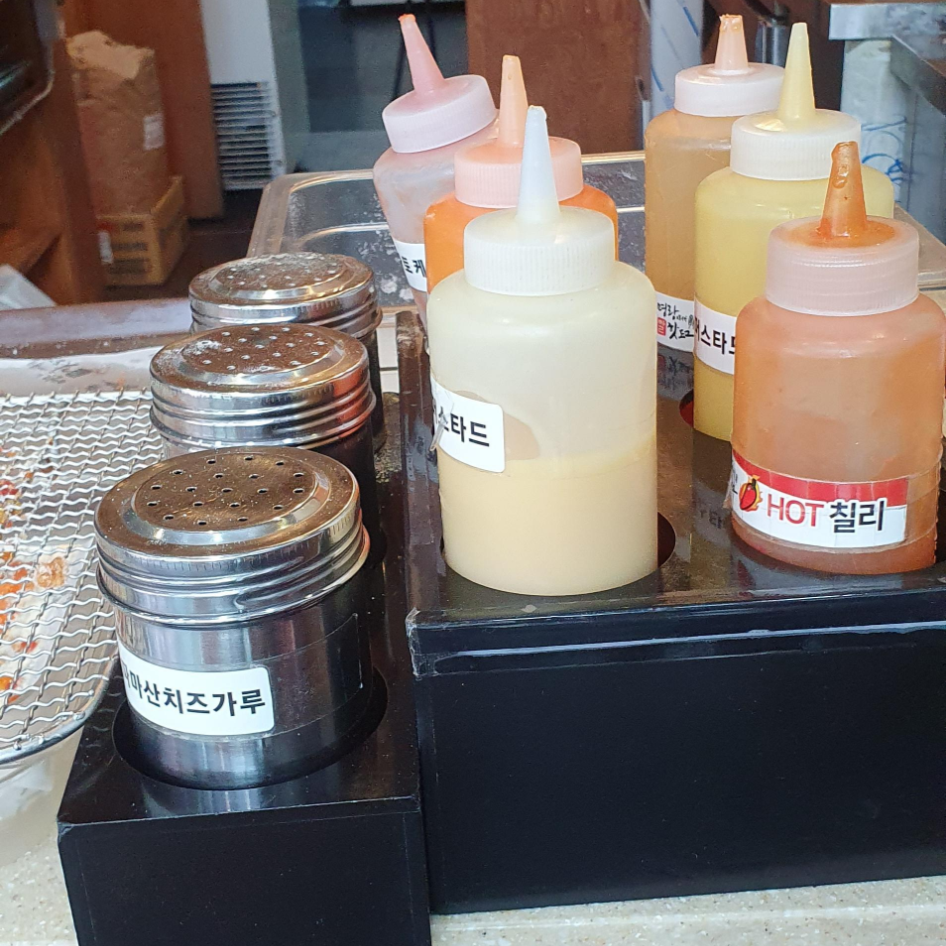 그리고 핫도그가 다 튀겨지면, 소스와 시즈닝이 많아서 기호에 맞게 뿌려 먹을수 있죠!