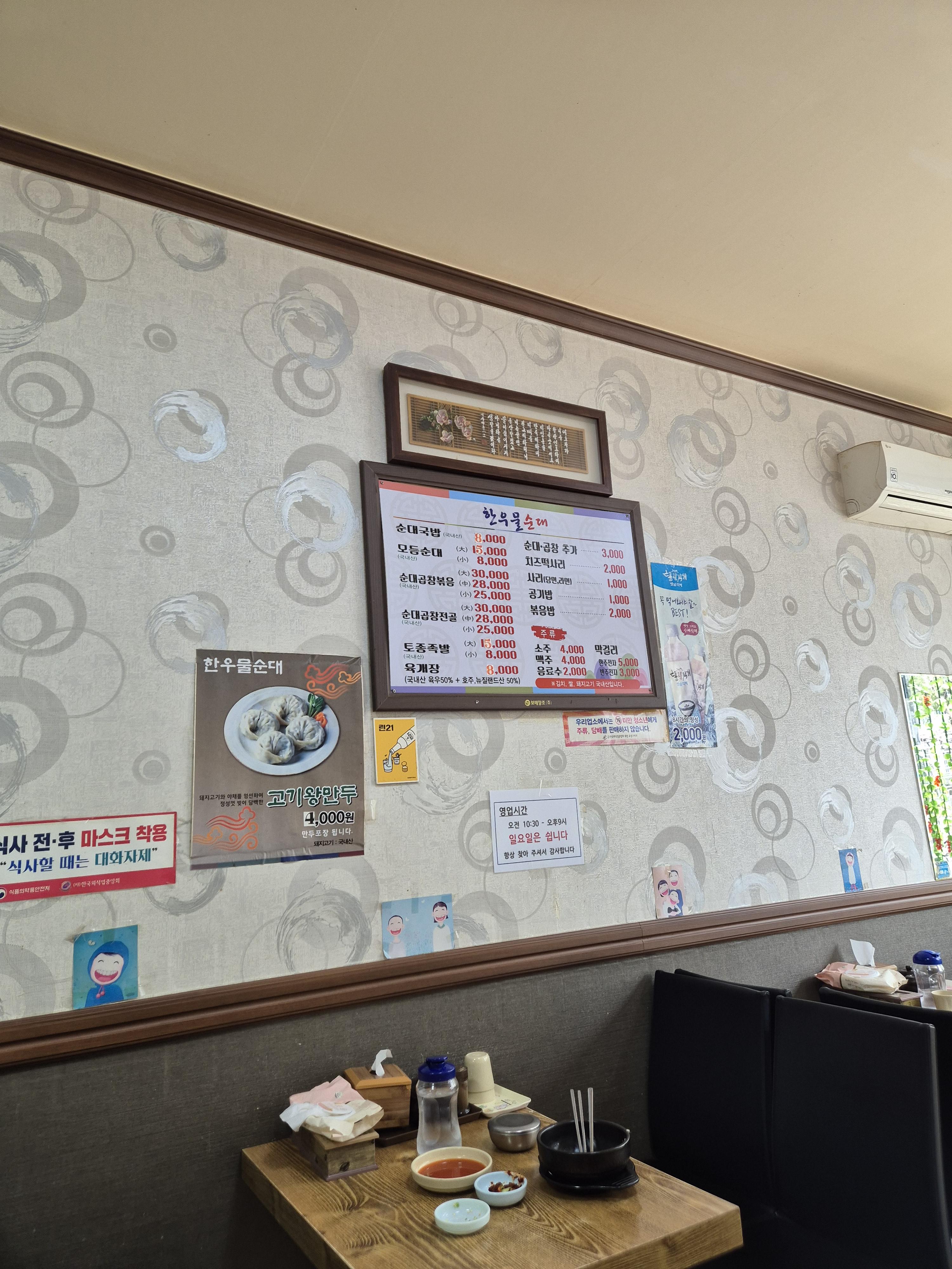 대정동 한우물순대 메뉴판입니다.