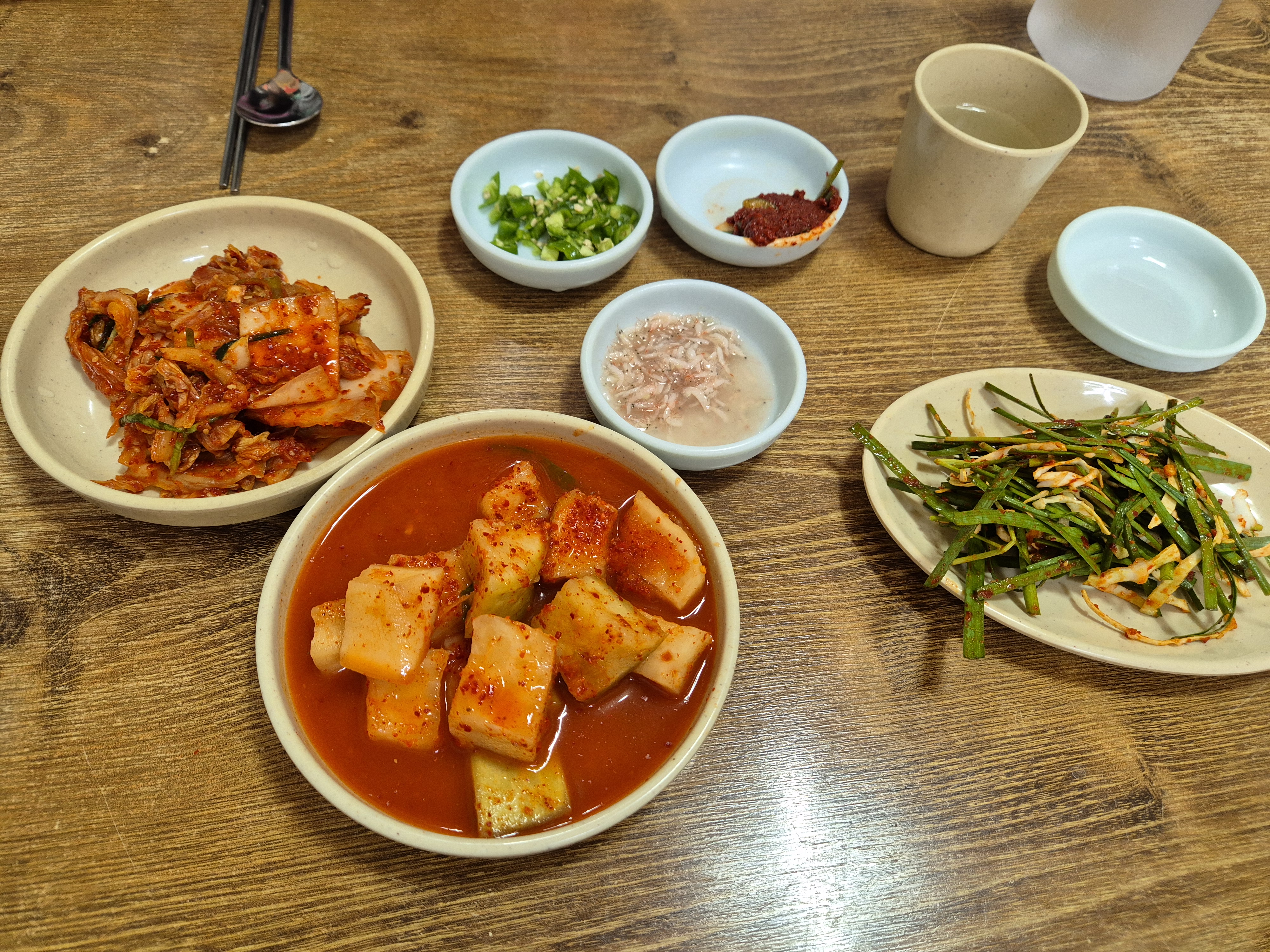 반찬은 배추김치 깍두기 부추무침 청양고추 다대기 새우젓 이렇게 나옵니다.