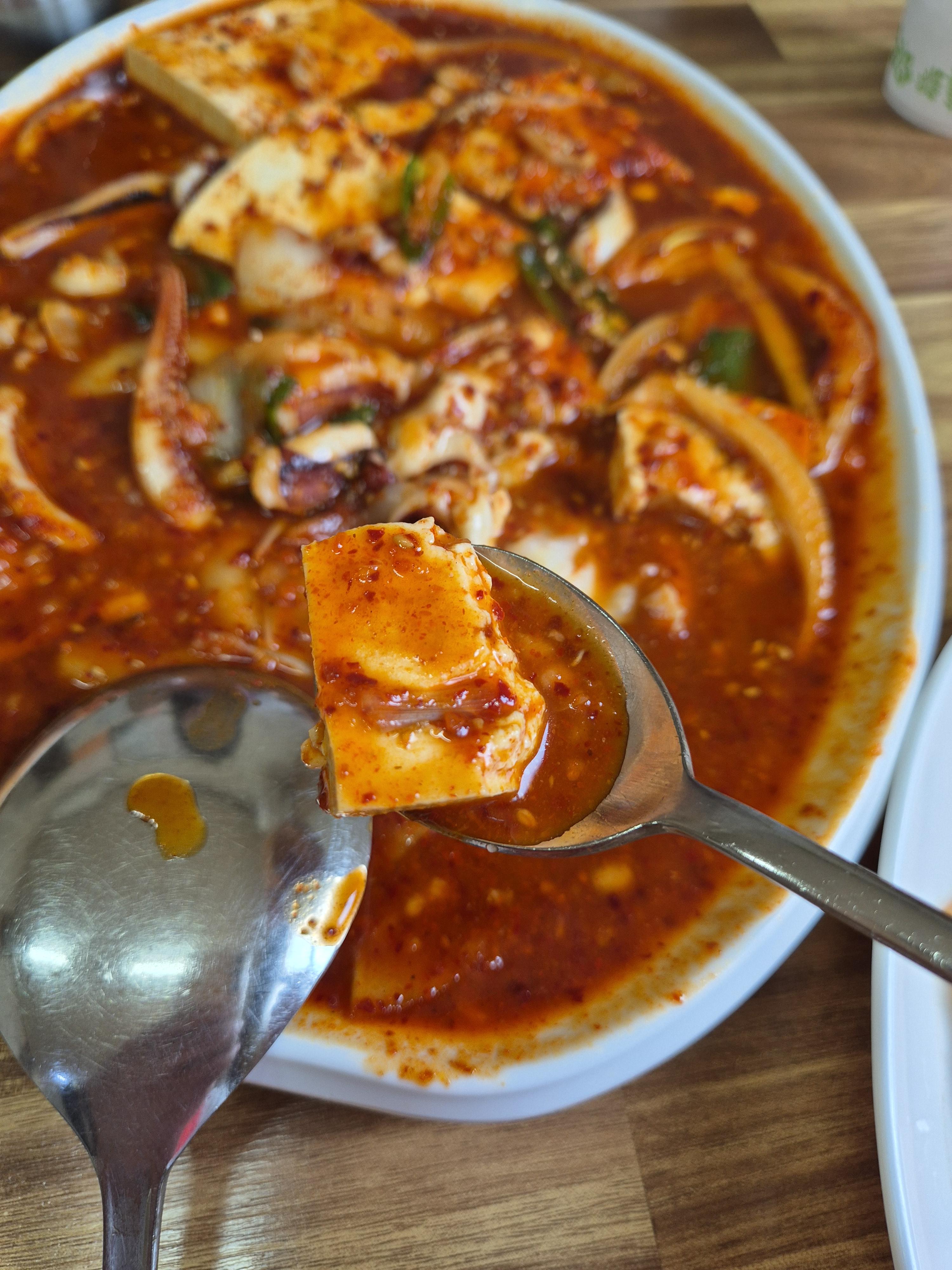야들야들은 두부 두루치기와 속 안에 들어가는 오징어가 궁합이 참 좋습니다.