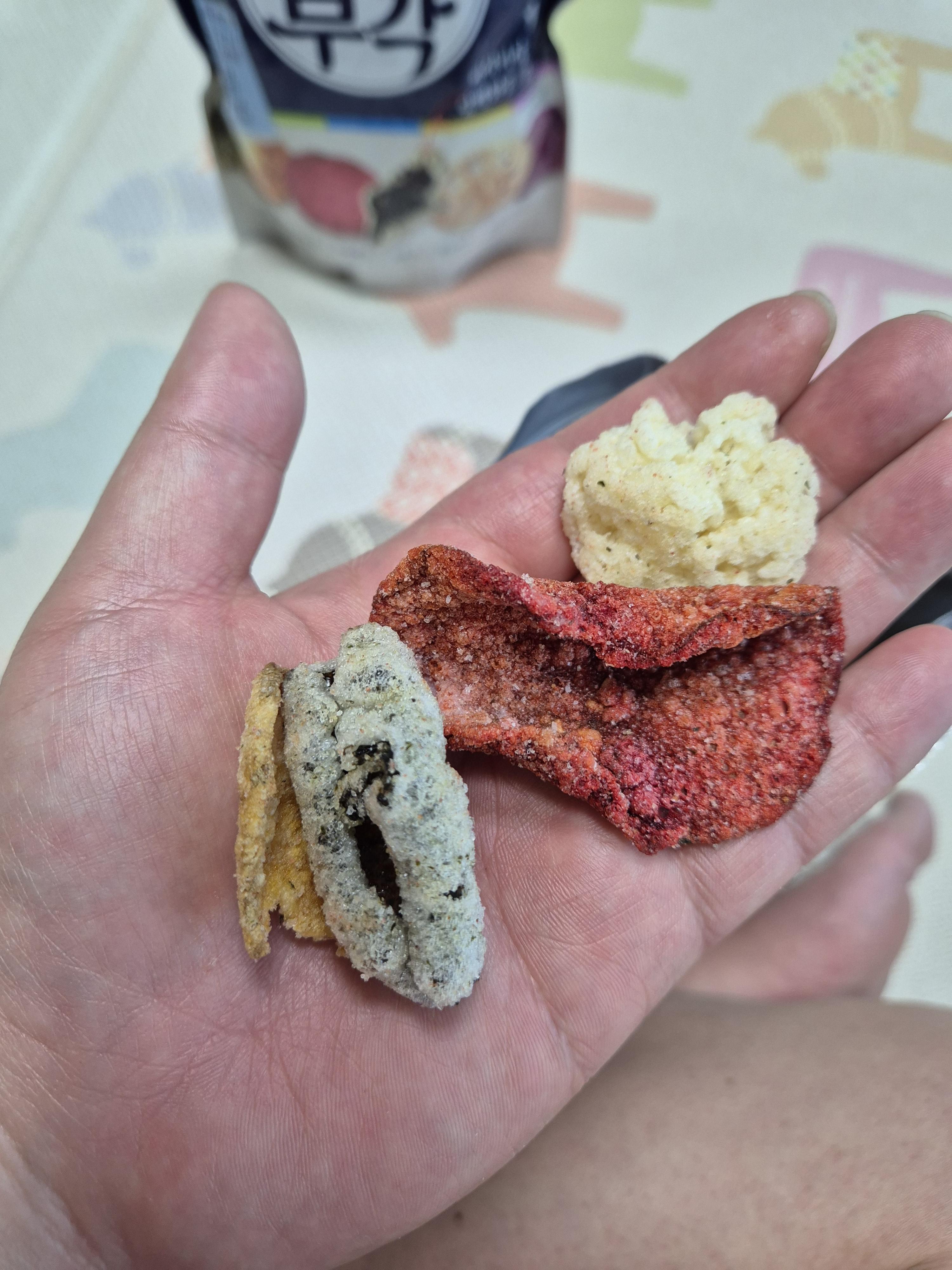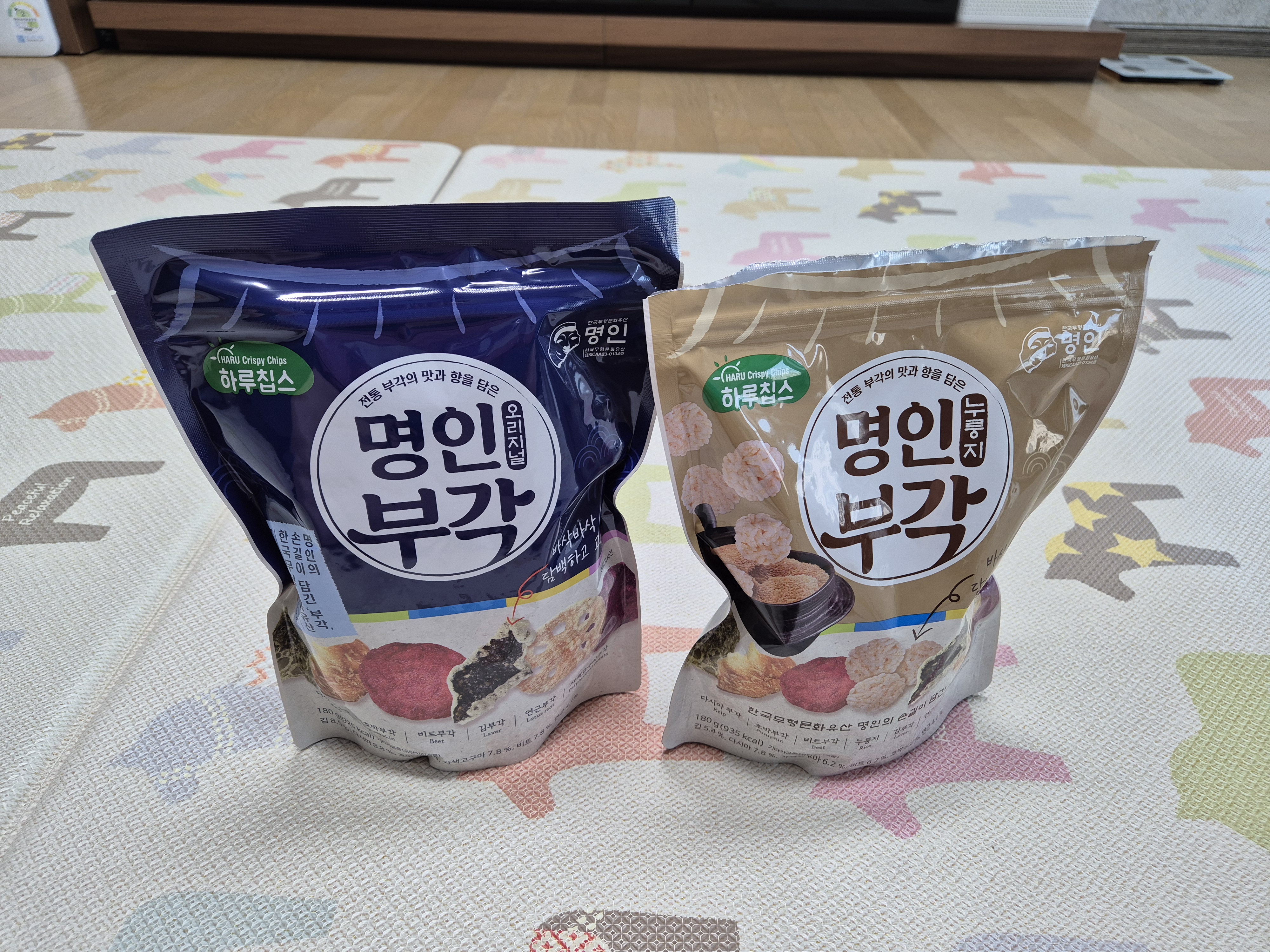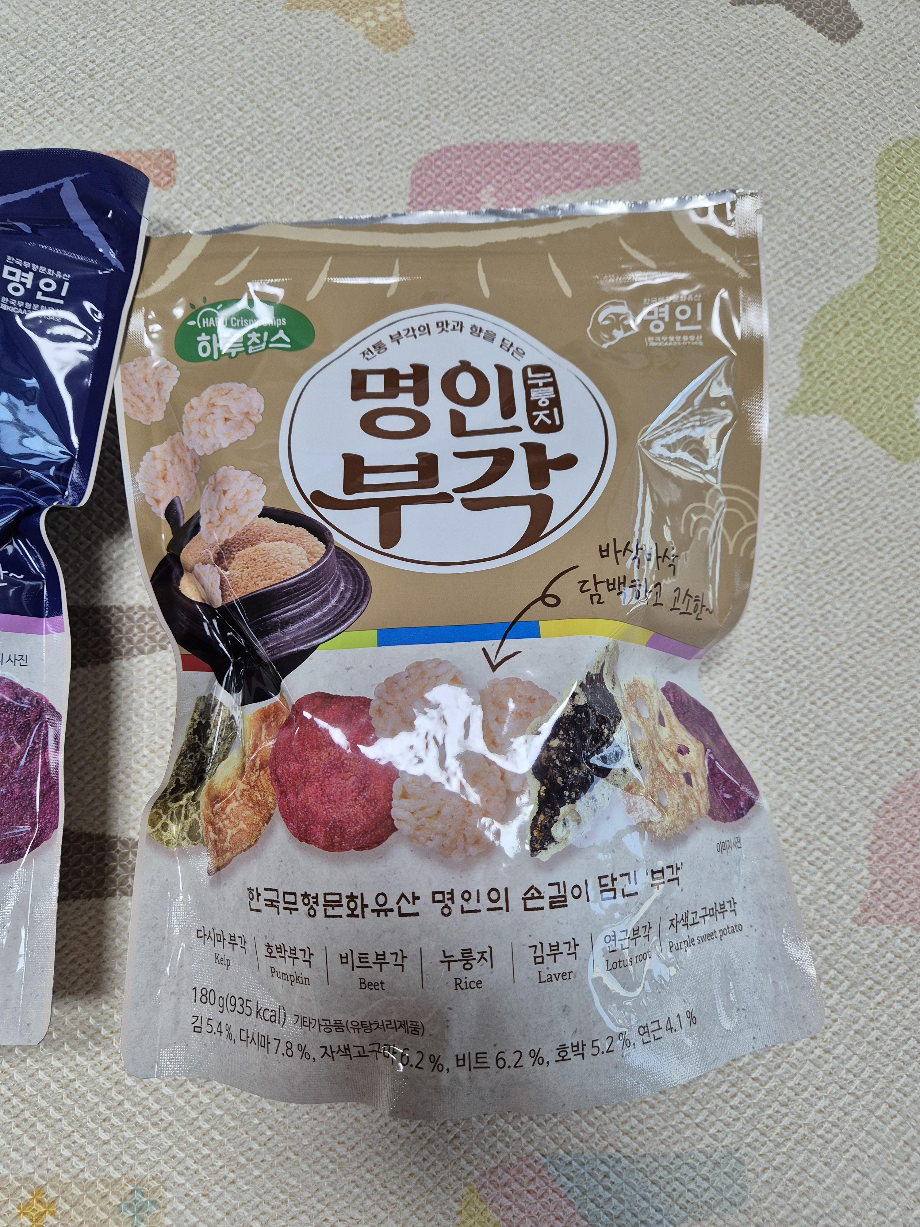 두 봉지 중에 어떤 걸 먼저 뜯을까 고민하다 옆에서 아이가 누룽지가 맛있을 거 같다며 누룽지 부각을 뜯자고 합니다.