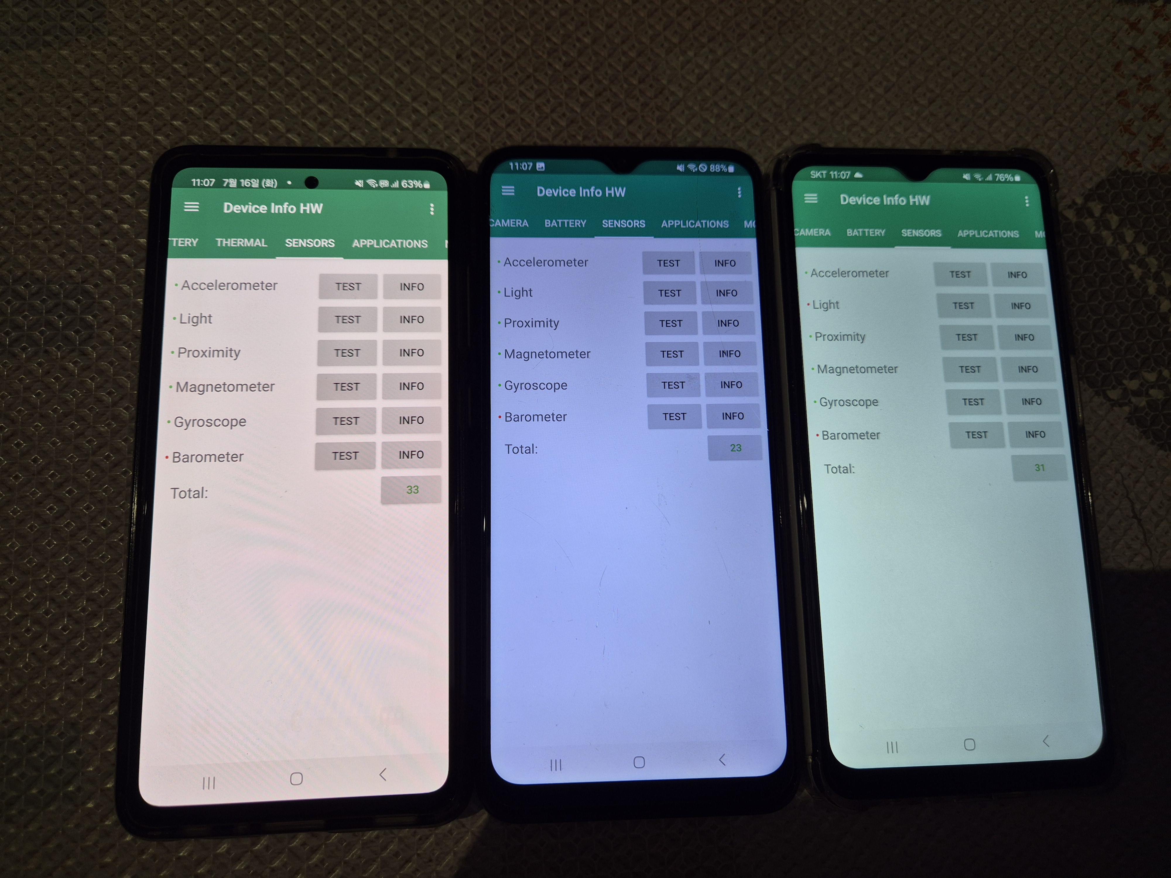 위와 마찬가지로 왼쪽부터 A52S, 버디1, 와이드6 모델이 가지고 있는 센서입니다.