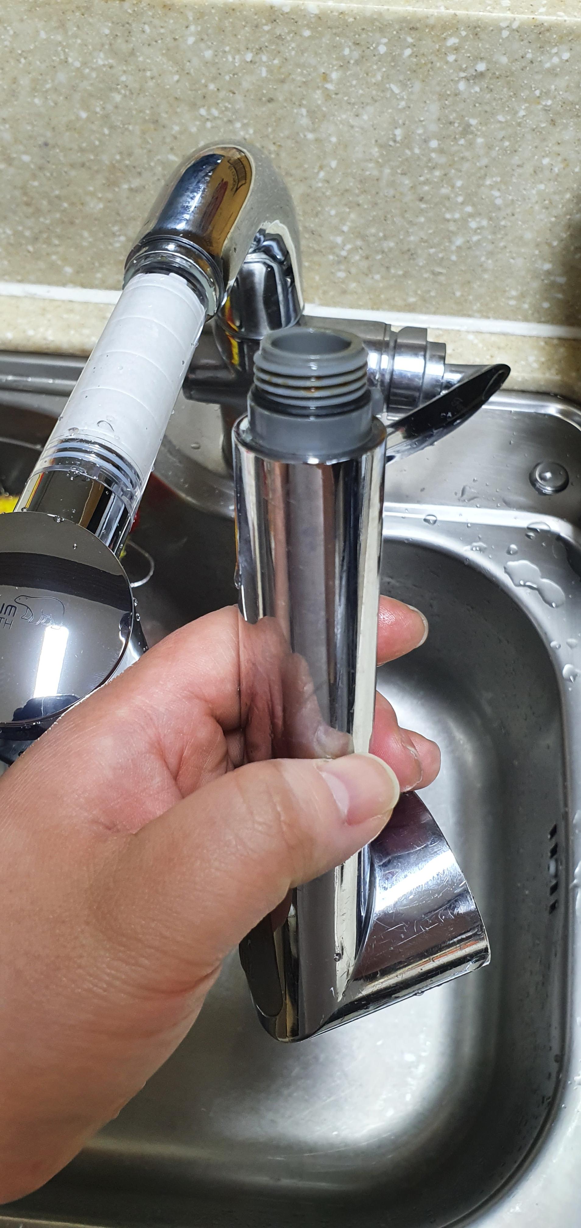 기존 싱크대 꼭지 부분은 당긴 다음에 돌려서 빼면 됩니다.