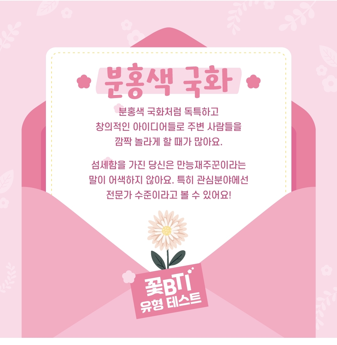 저도 간단하게 설문을 받아보니, 분홍색 국화라고 나왔습니다.