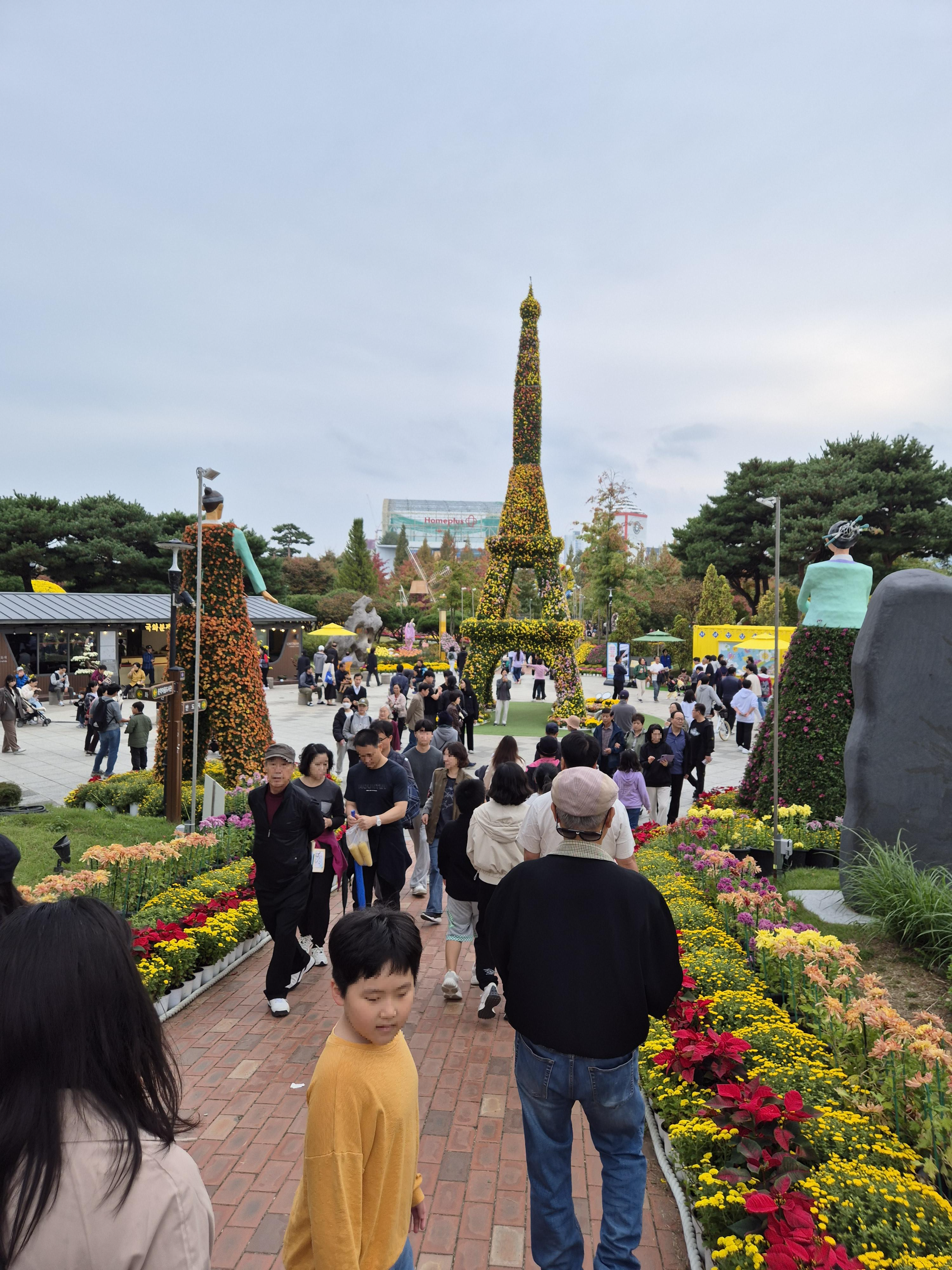 A존에는 많은 국화 조형물이 있습니다. 에펠타워도 있고, 시바견 동상도 있고, 로봇 태권브이 동상도 있습니다.