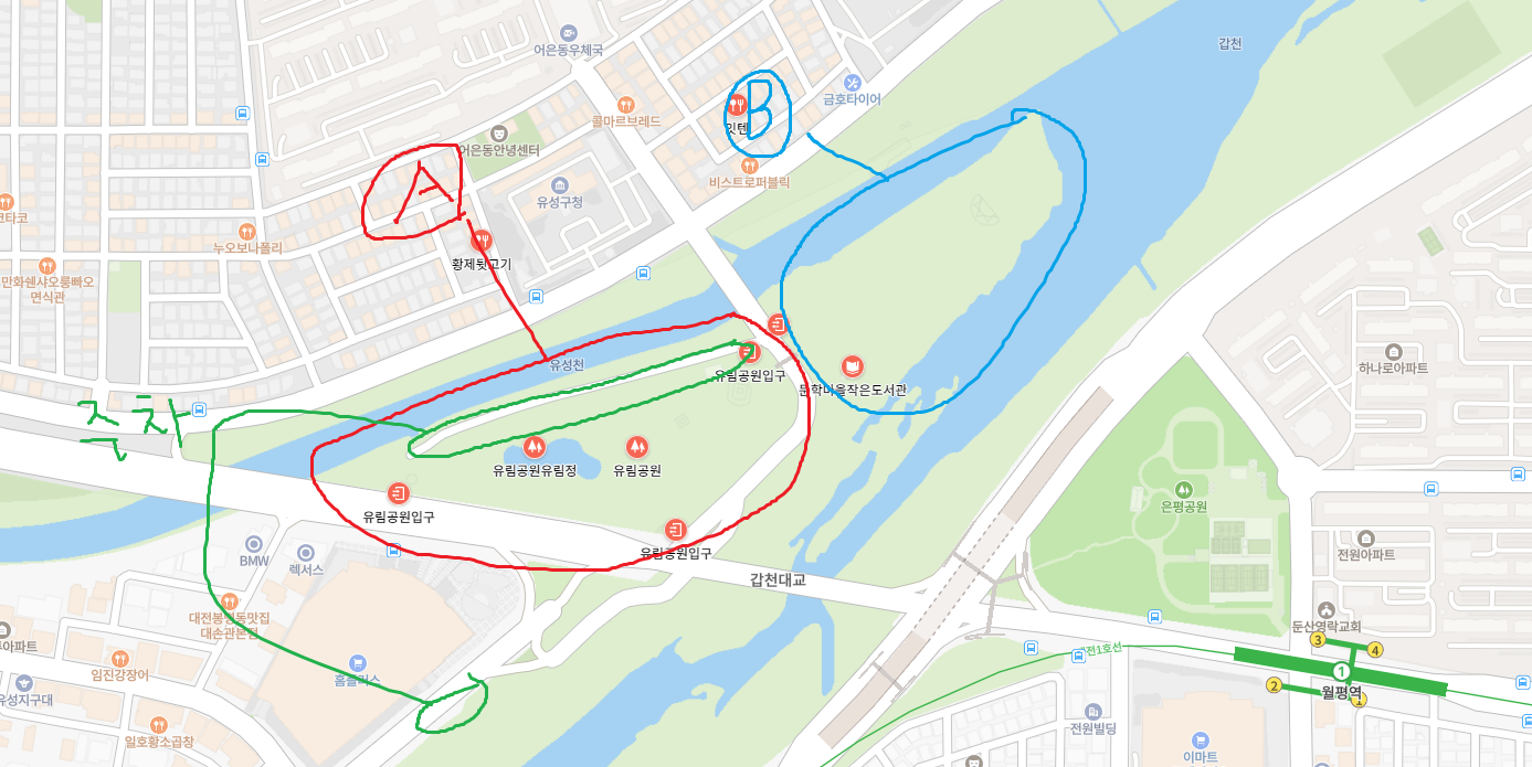 여름 장마때, 물이 넘쳤던 갑천을 바라보며 유림공원으로 향하고 있습니다.
