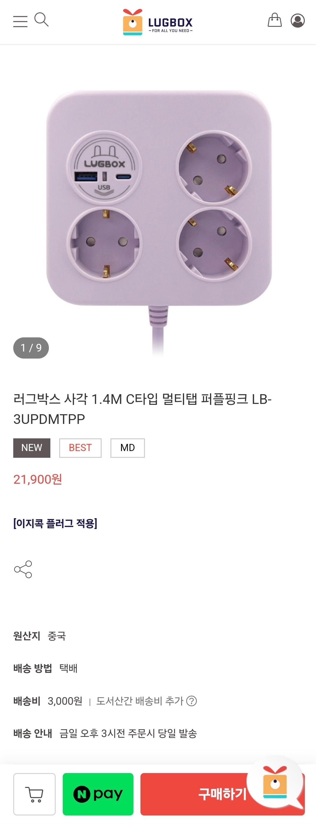러그박스 3구 멀티탭 충전기 포함 최저가