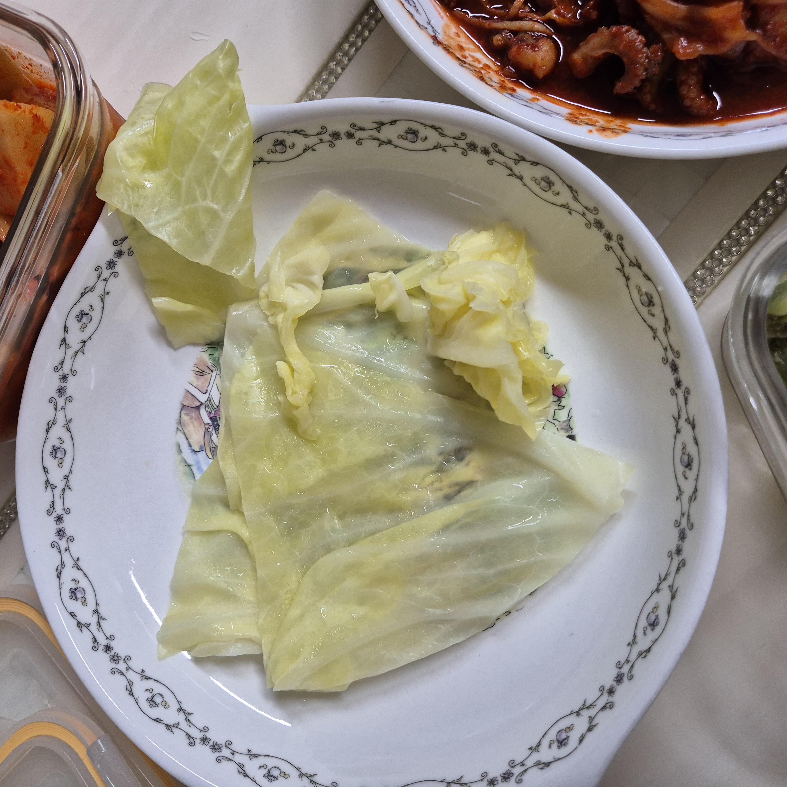 콘치즈를 하나 하고, 양배추 쌈을 7분 삶아서 준비했습니다.