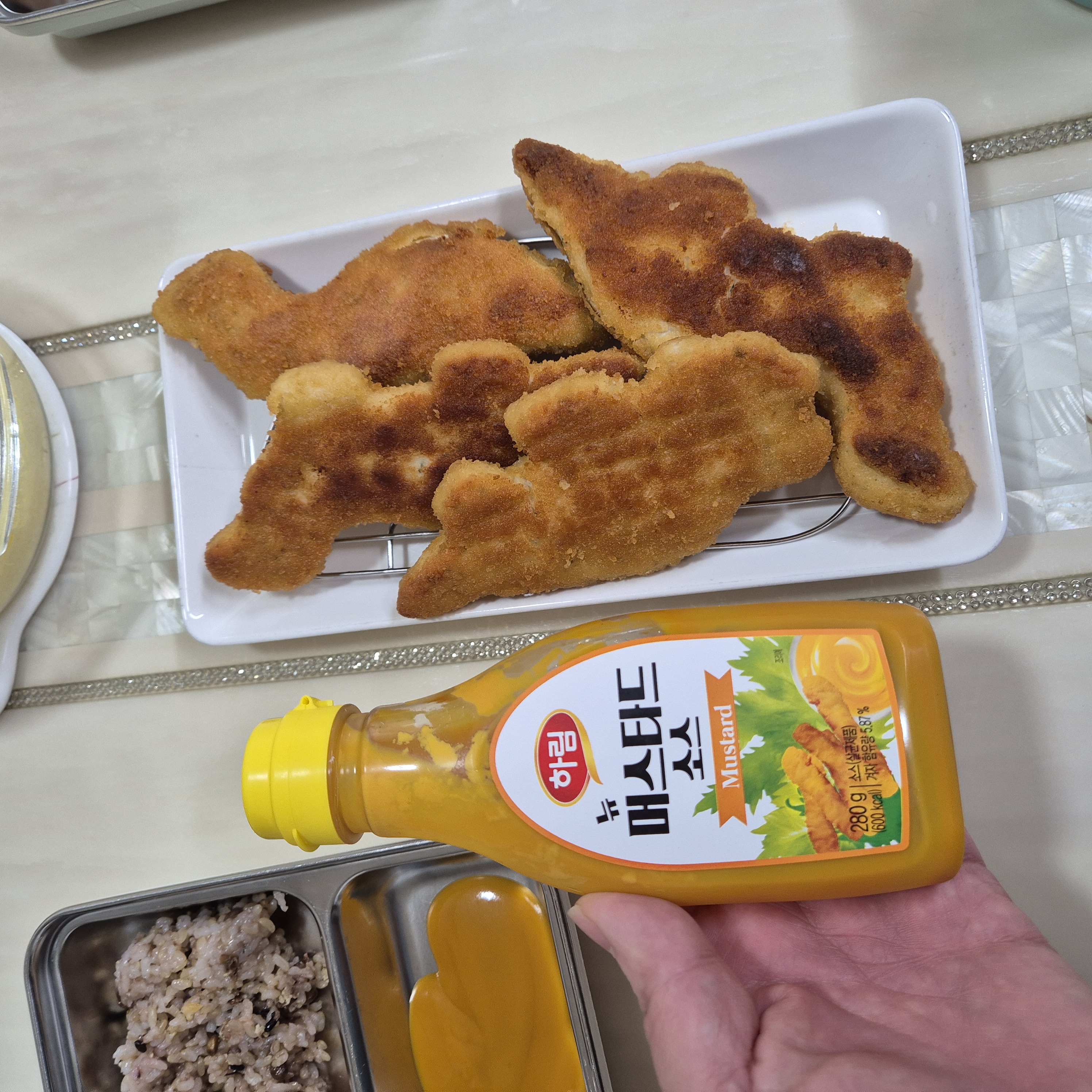 제 손이랑, 하림 머스타드 소스를 옆에다 대어 봤습니다.