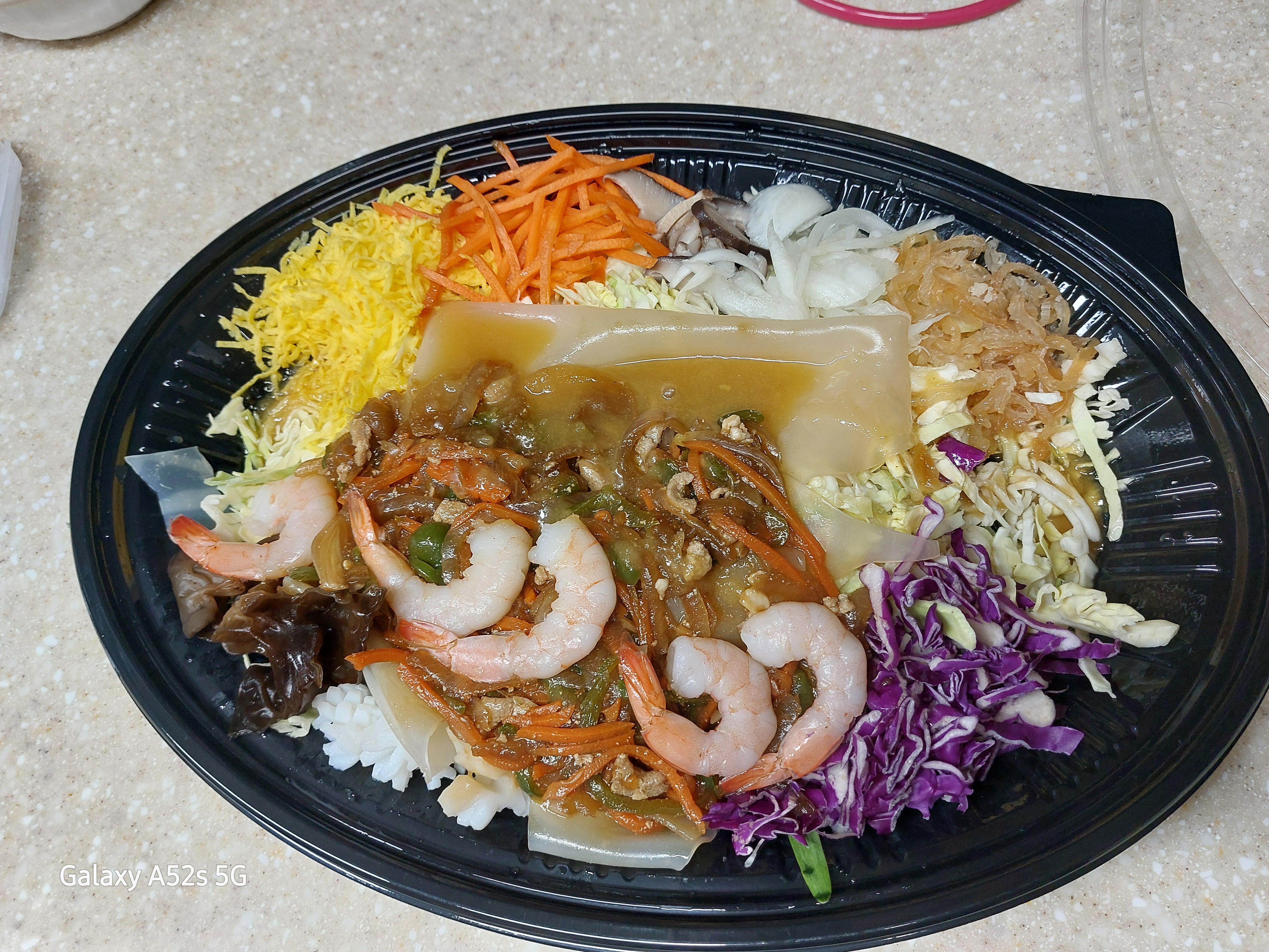 들어간 재료는 새우, 해파리무침, 적양배추, 양배추, 꽃오징어,계란지단, 표고버섯, 목이버섯, 양파, 당근이 골고루 들어가 있습니다.