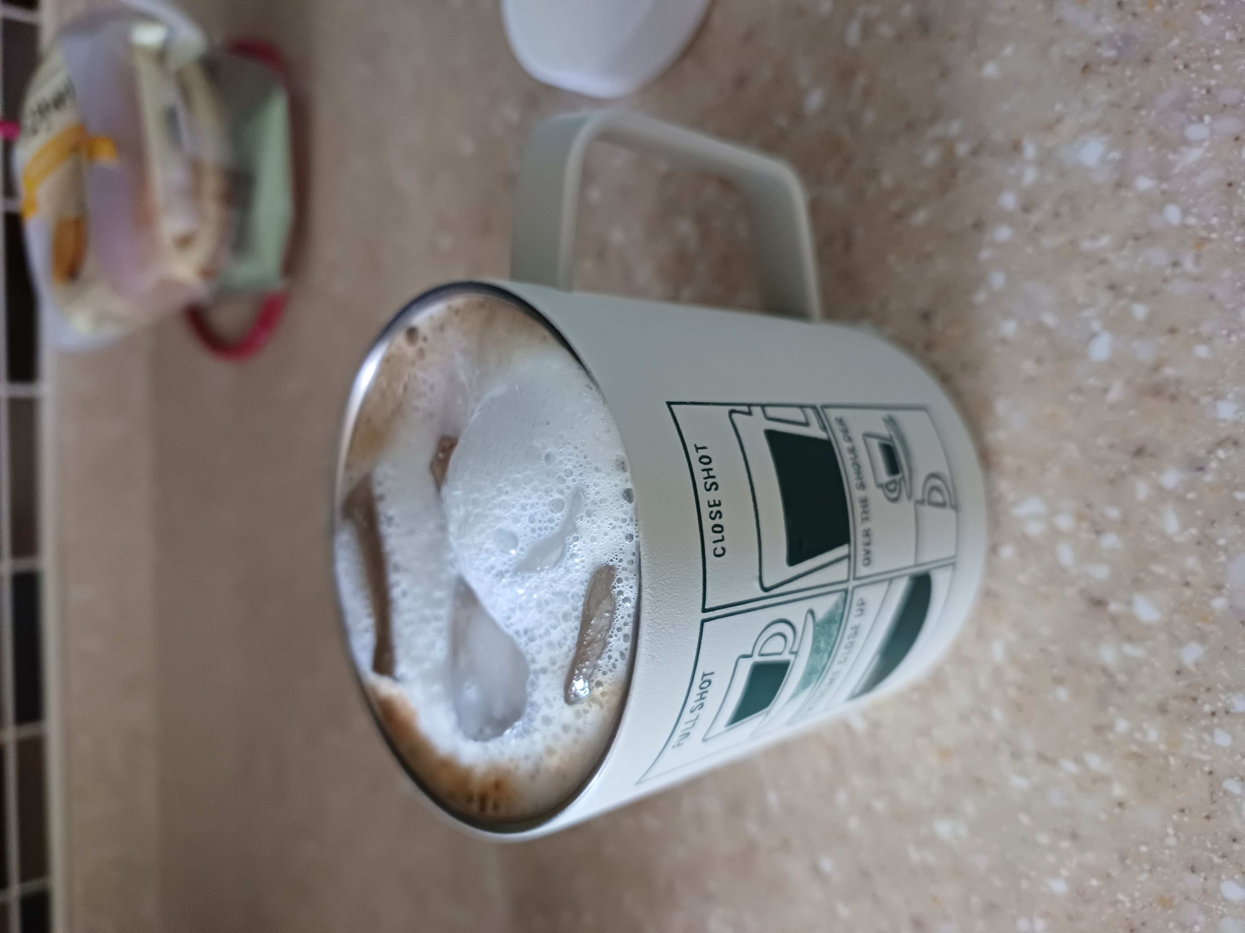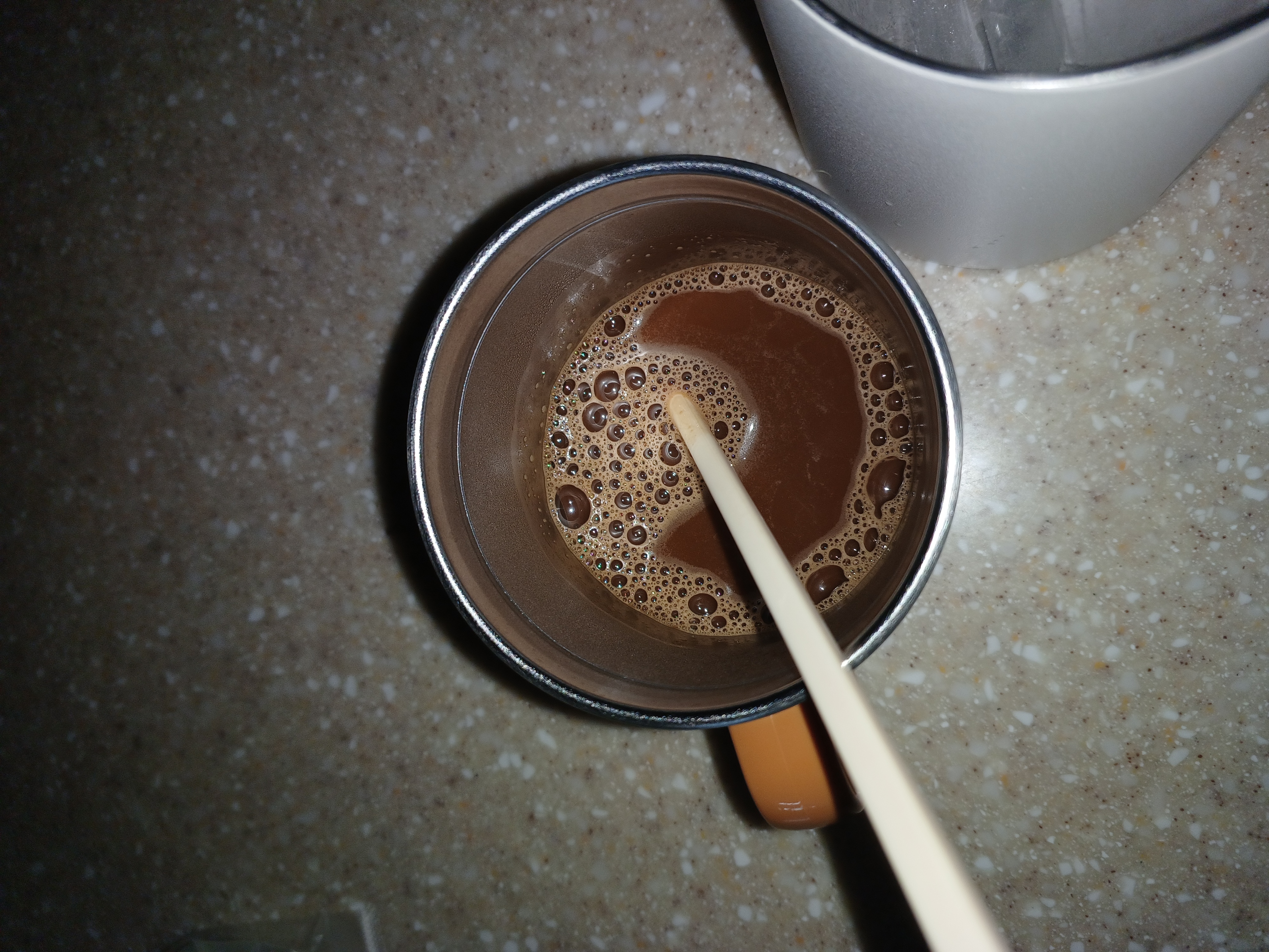1. 커피원액만들기 : 믹스커피와 카누를 컵에 쏟고, 뜨거운물 30ml (=소주잔 절반)를 넣고 커피를 녹여주세요.