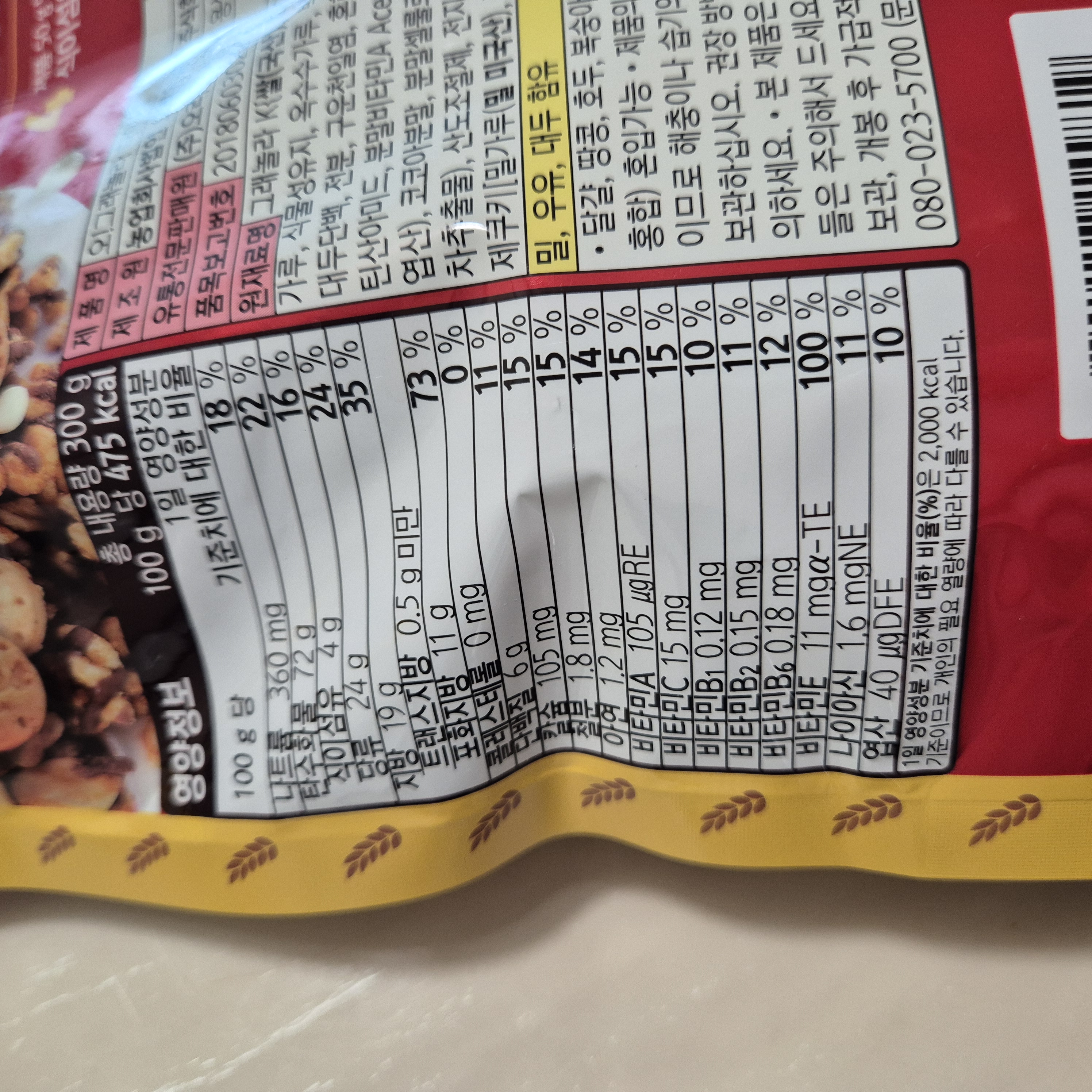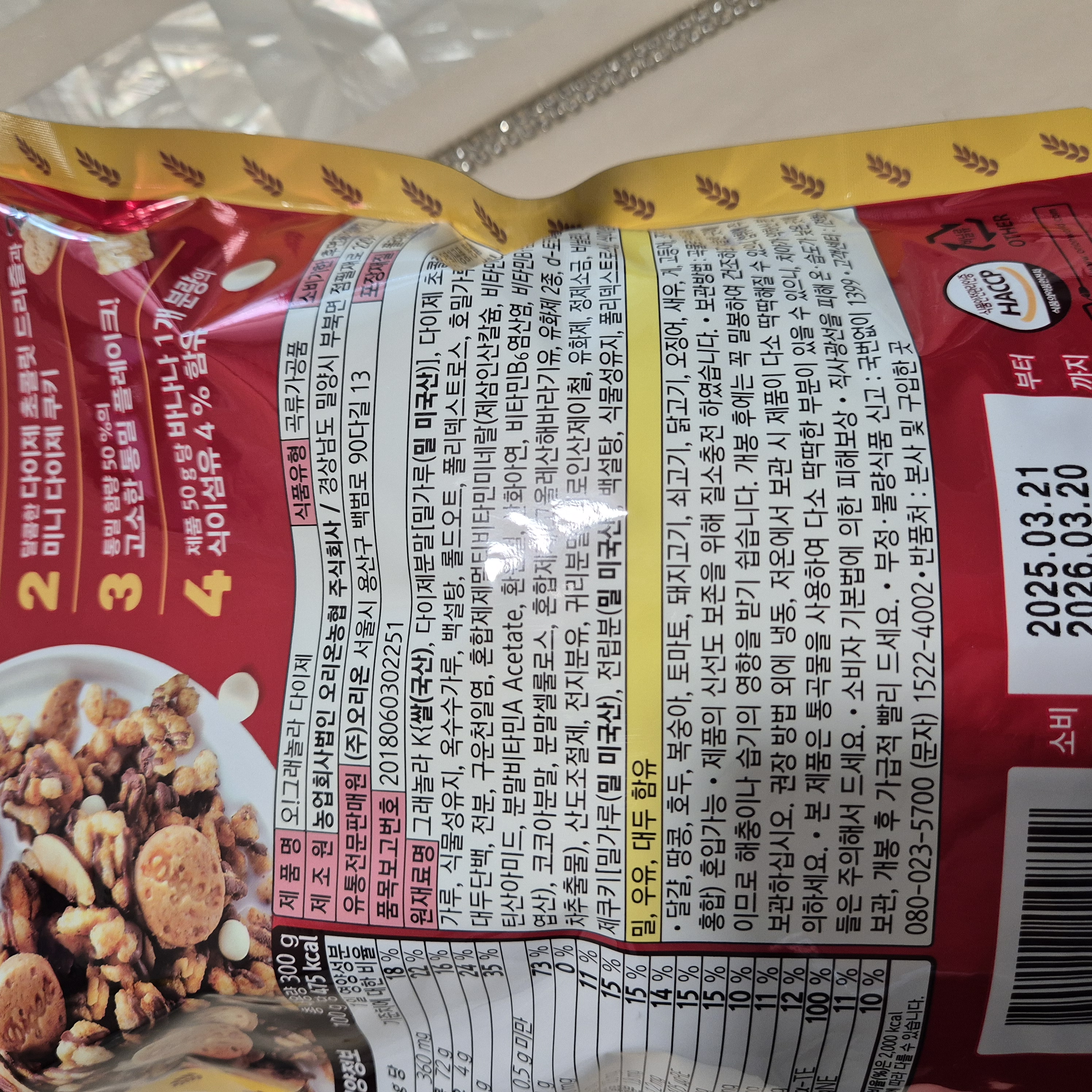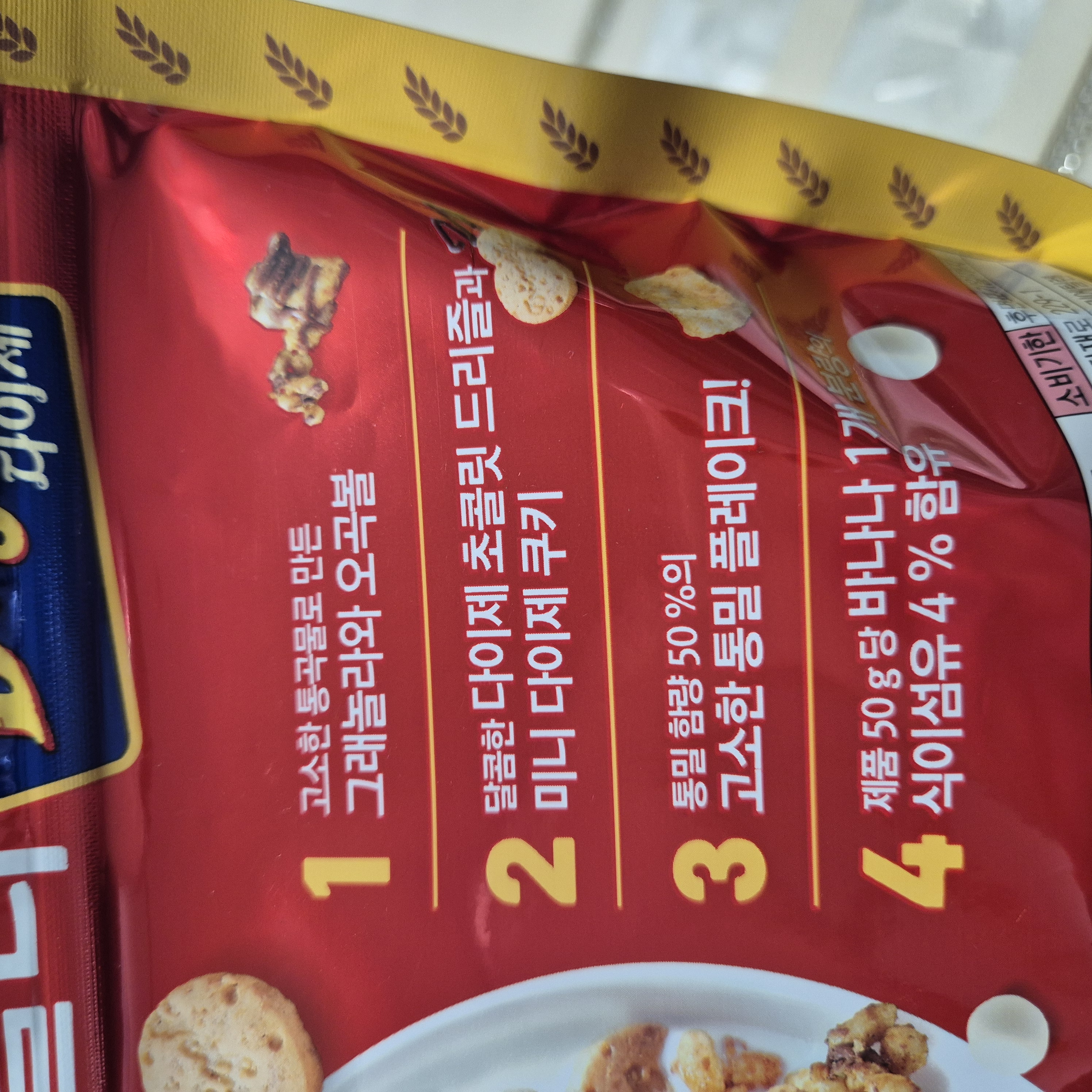 들어간 성분은 그래놀라 94%, 다이제쿠치 5%, 식이섬유볼 1%