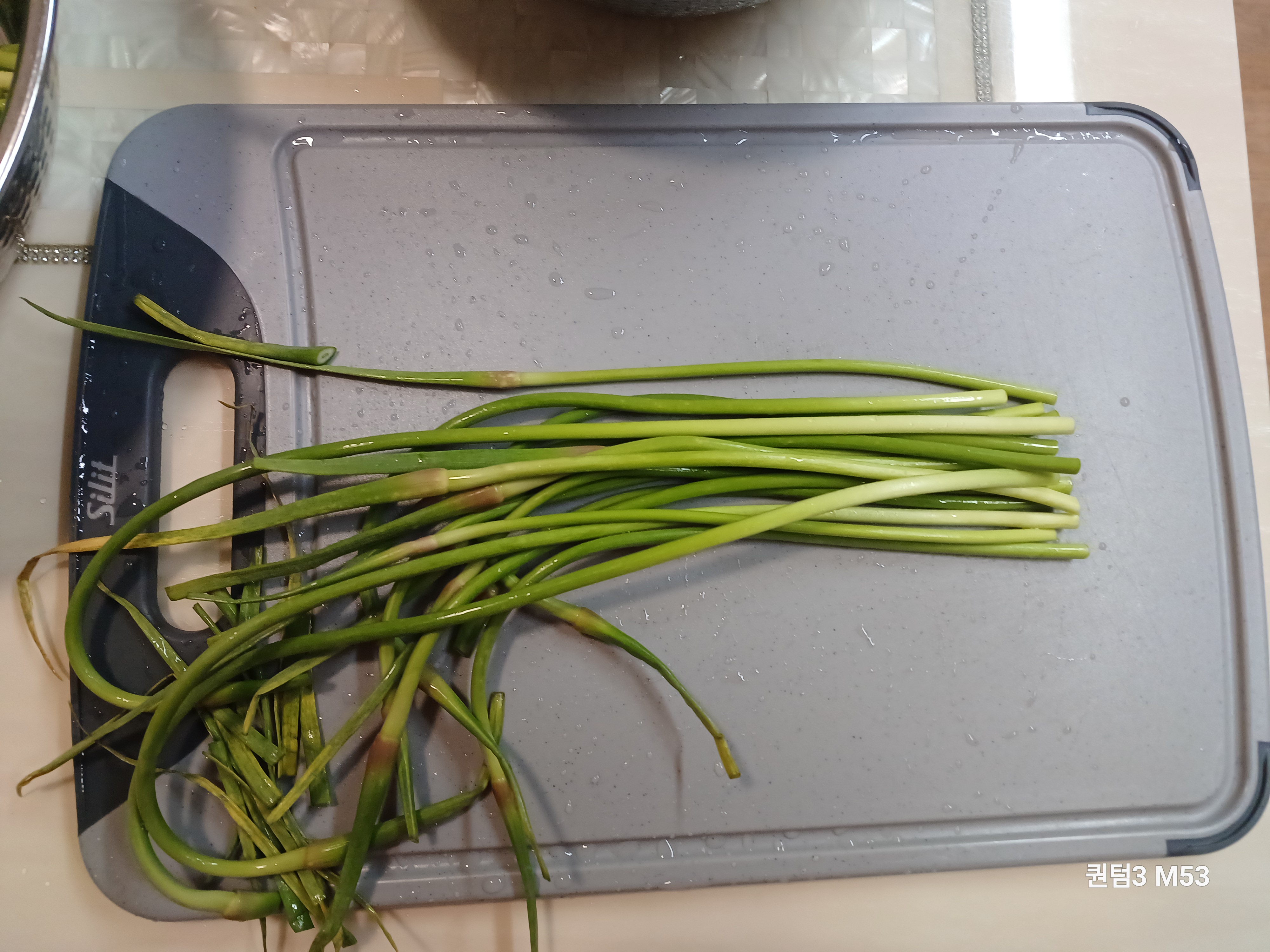 맨 끝에 마른 부분과 끝에 깔끔한 부분을 잘라주고, 먹기 좋게 마늘쫑을 잘라 줍니다.
