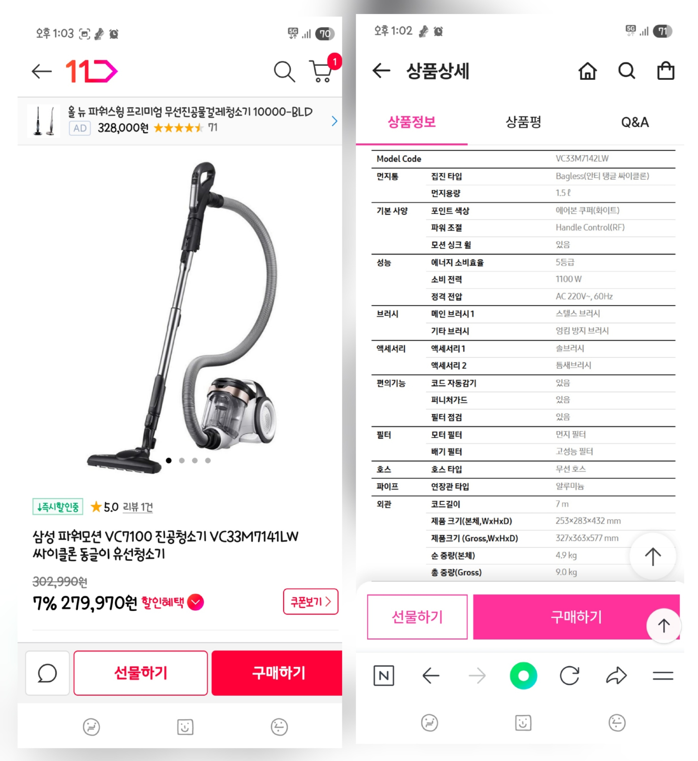 5. 가격은 13만원 7100이 더 비쌈.