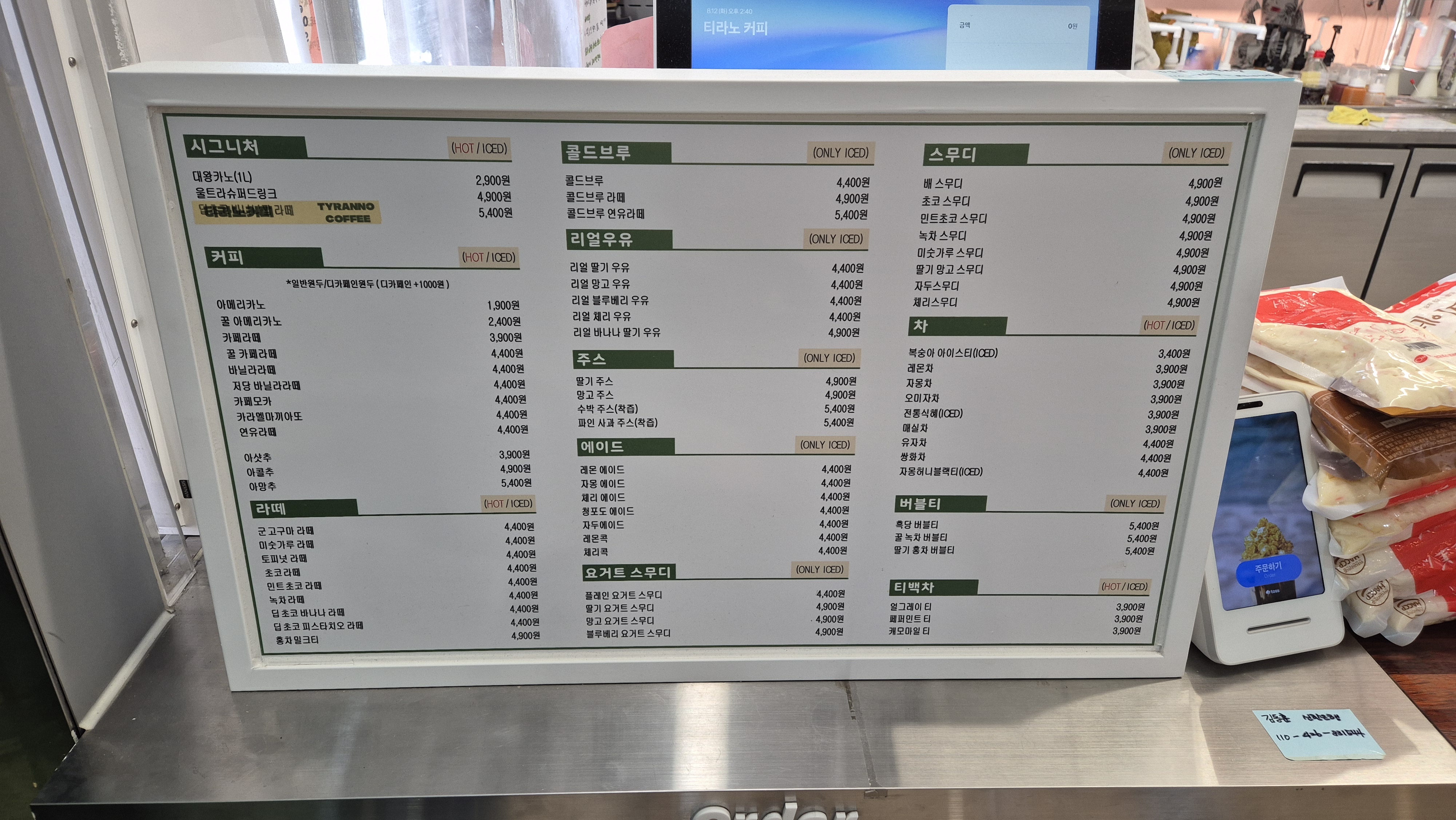 속초 티라노 커피에서 판매하는 음료 종류입니다.