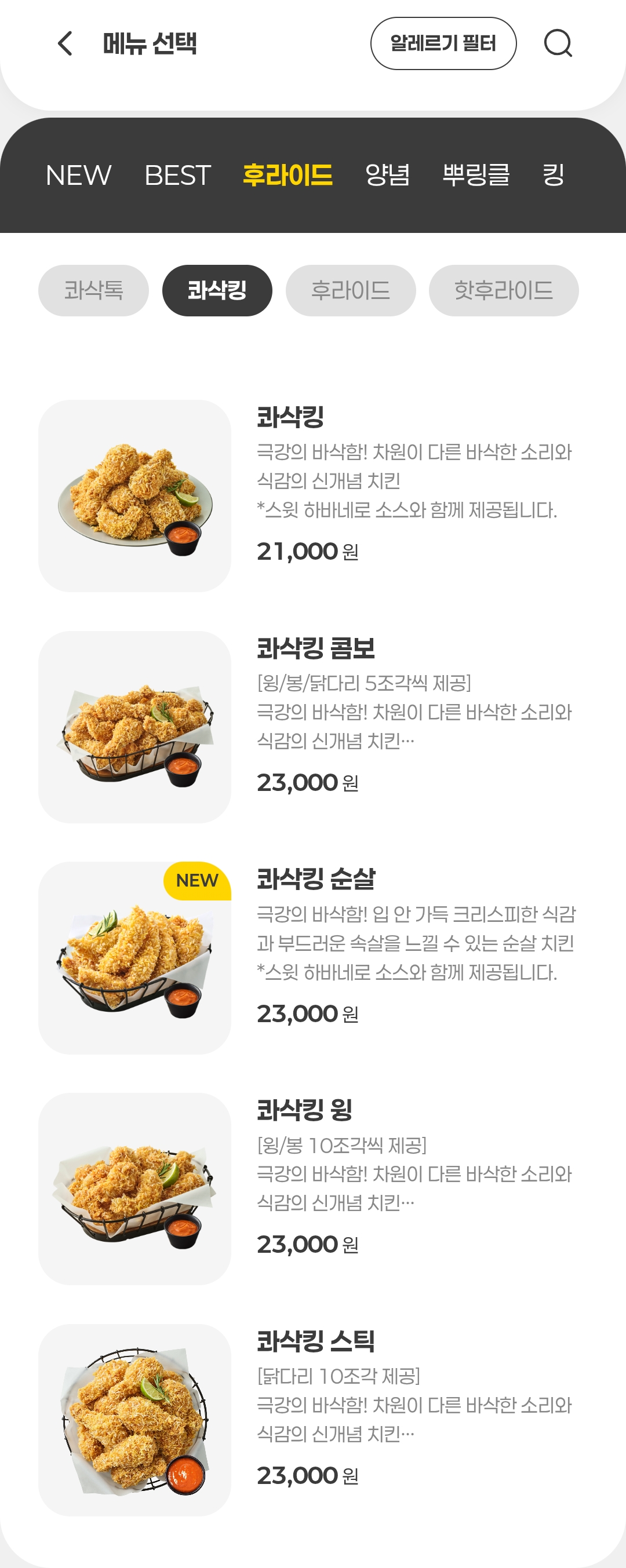 콤보, 윙, 스틱, 순살로 콰삭킹을 주문하시면, 23000원입니다