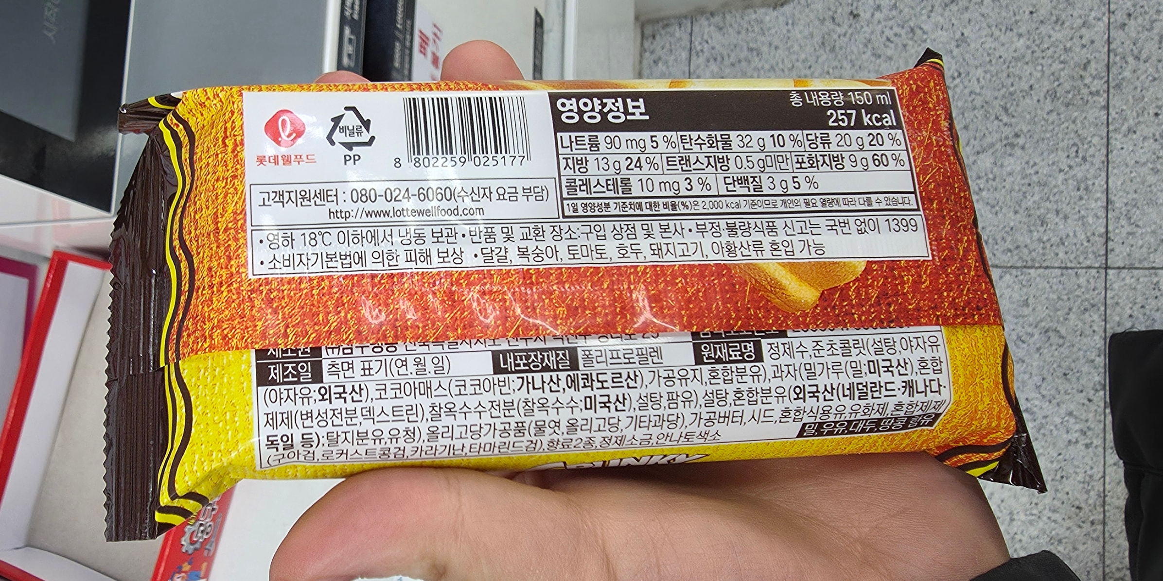 크런키 아이스크림은 아무래도 초콜렛이 들어가 있어서 칼로리는 두바이 쫀득 쿠키랑 비슷한 257kcal를 가지고 있습니다.