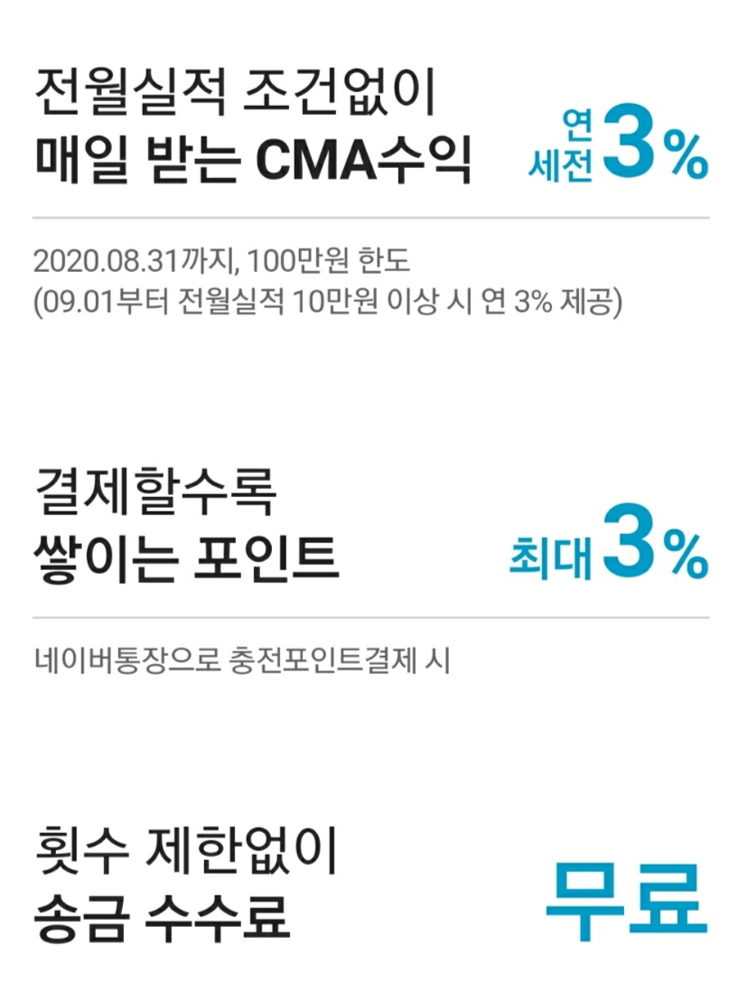 하지만 네이버 통장의 금리는 무조건 3%는 아닙니다. 연3%의 금리를 유지 조건이 붙어 있습니다.