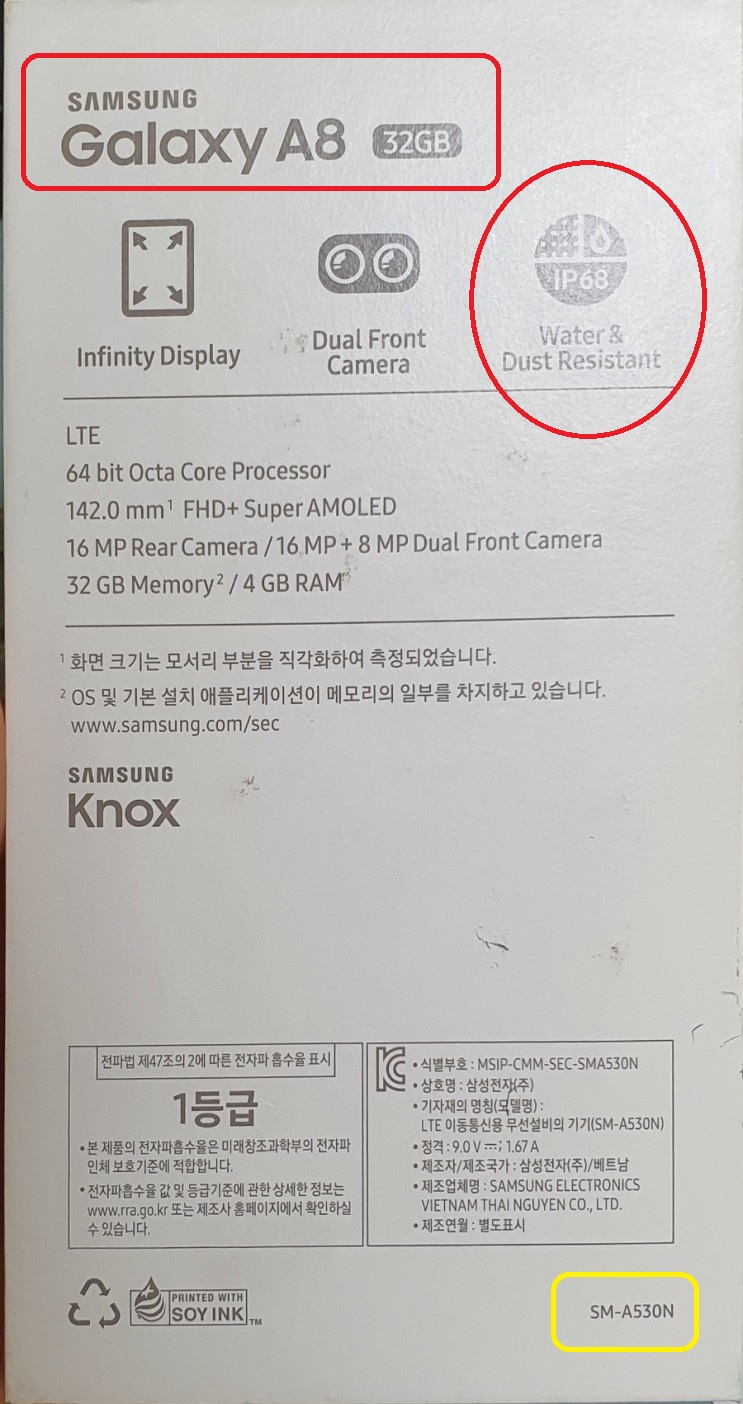 전에 구매했떤 갤럭시 A시리즈에서 방진방수 등급을 받았던 갤럭시A8 2018 모델의 박스 설명을 보자!