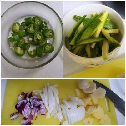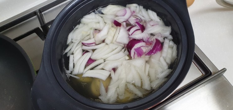 2) 냄비가 끓을 동안, 감자, 양파를 그냥 적당히 두껍지만 않게 썬다. 애호박은 길쭉하게 채썬다.