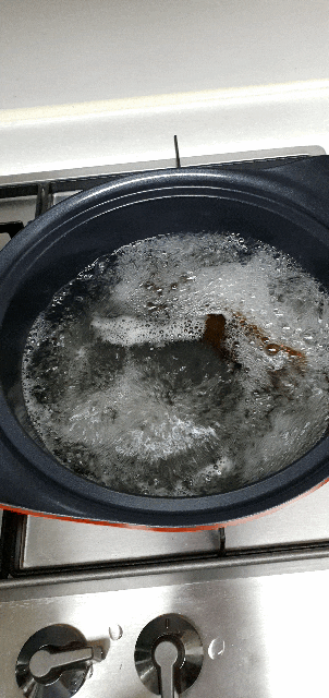 1) 냄비에 물을 붓고, 센불로 끓인다. 여기에 다시마 1개를 넣는다.