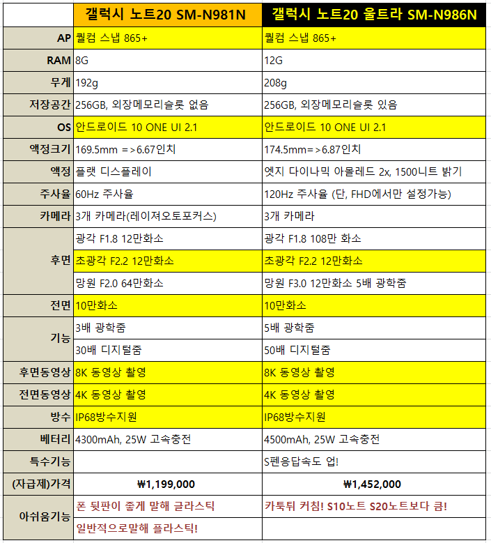 갤럭시 노트 20 VS 노트 20 울트라 비교 표입니다.